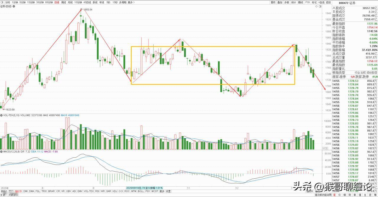 券商板块本周下跌2%,收了一根放量长上影阴线,连续四根阴线下跌,基本吃掉了上周的涨幅,刚想出头表现,就被上面给按住,涨的时候没出力,跌的时候没落下。不过这里已经连续两天收长上影线,是试盘信号还是压力重重,下周自有答案。 从日线级别来看,这里已经在构建一中枢下跌结构,目前正在走向下的离开段,下周就看这笔离开段的力度,最好能不破前低反手构建二买,从而开始周线级别的上涨。券商行情 券商