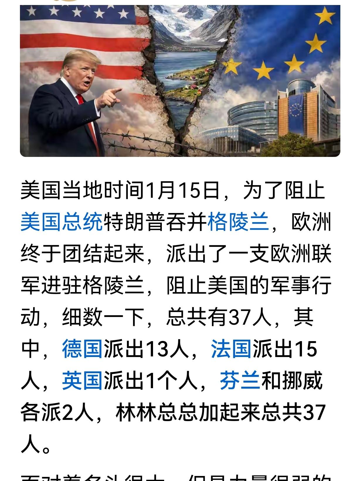 终于看出来北约内部团结的虚伪性。当美国扬言不惜任何手段也要格陵兰岛的时候,欧洲的那些国家,那些敌对中国的国家,那些北约成员的国家,一下子炸锅了,“我们都是你小弟啊,你怎么不讲武德”,犹如一群黑狗,白狗,花狗,板凳狗,癞皮狗,对着曾经大哥那个像狗一样的老虎狂吠,誓死要保卫格陵兰岛的主权,老虎对着这群狂吠杂牌军,连理都不理,“我看中了你,你从也得从,不从也得从”,非常像电视剧中土匪黑话,看到这个跟了多年的大哥这么不讲情面,这些欧洲小弟终于不再忍了,派兵保卫格陵兰岛,一支庞大的欧洲联军进驻了格陵兰岛,37人的联军,虽然只是一个排的兵力,但也得有一个司令部啊,那就看看谁出兵多少吧,德国13人,法国15人,瑞典3人,芬兰挪威各2人,英国1人,这支真正杂牌军真的雄赳赳气昂昂奔赴了格陵兰岛。而格陵兰岛的主权女总理,看到这个纹身大哥如此不讲理,不讲情面,就连昔日的卿卿我我也被这个大哥忘记了,剩下的只有伤心的泪水。