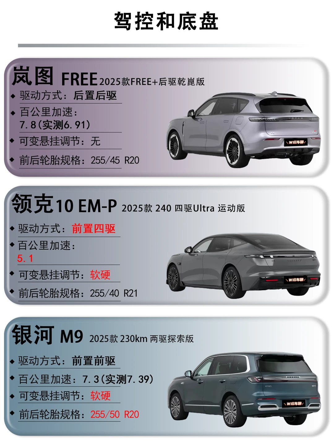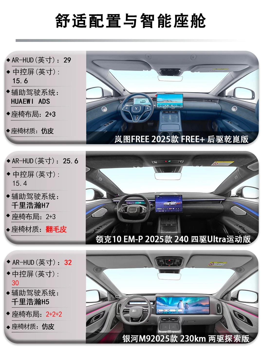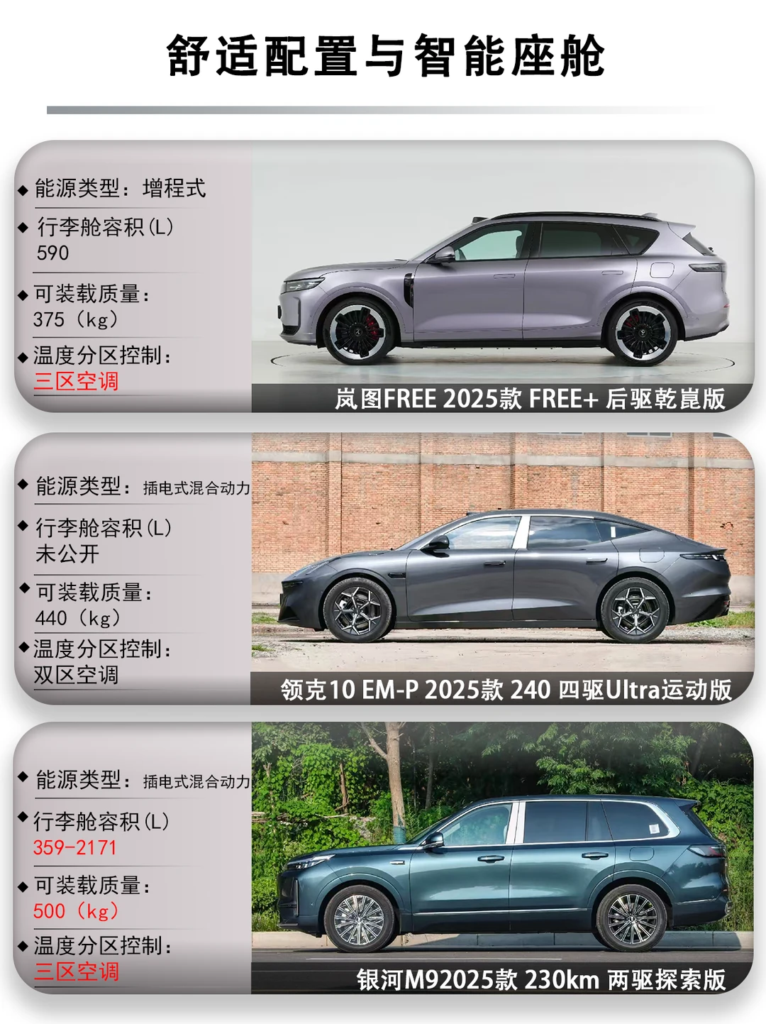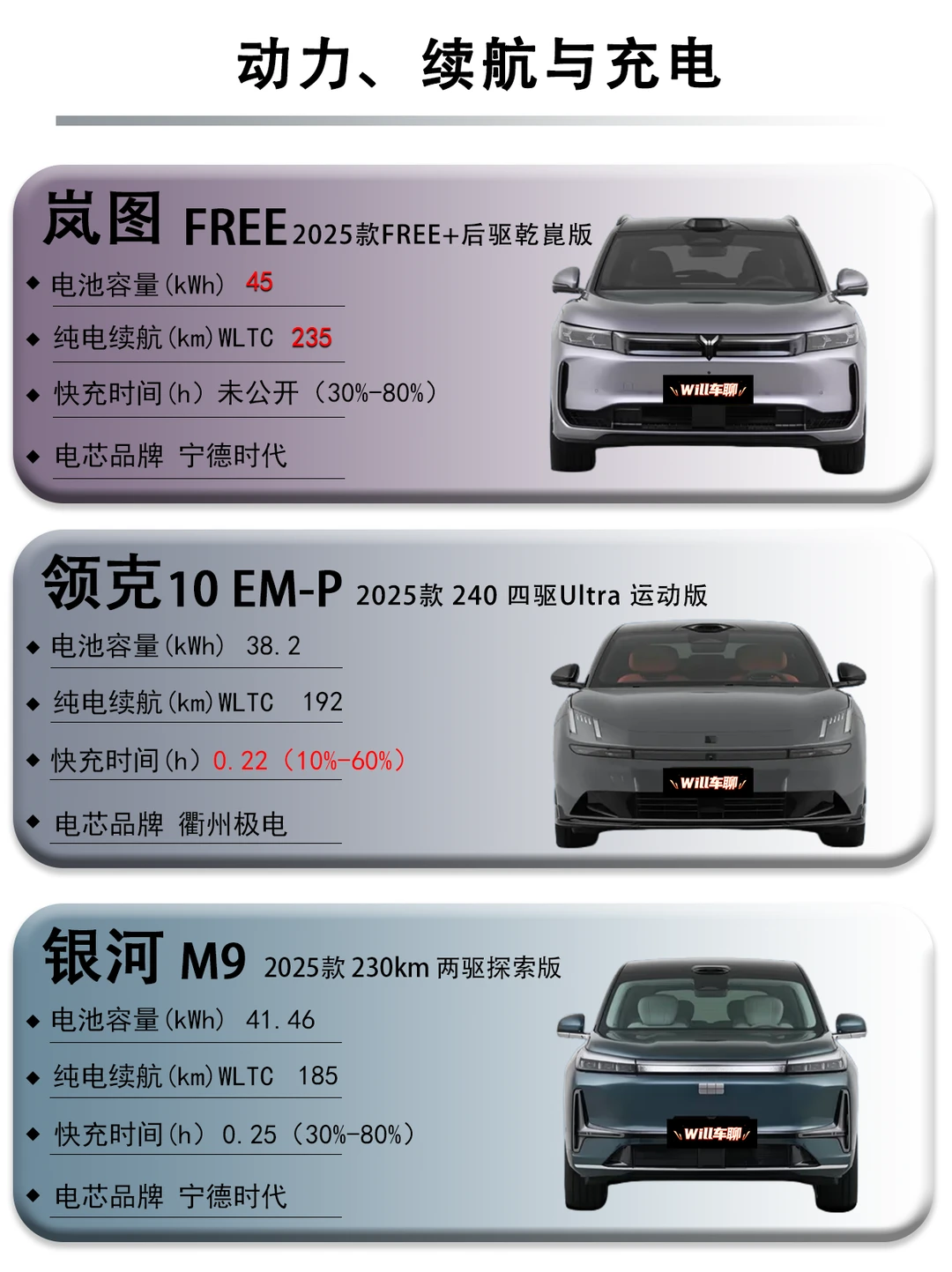 岚图FREE 2025款 FREE+ 后驱乾崑版(以下车型简称岚图FREE)、领克10 EM-P 2025款 240 四驱Ultra运动版(以下车型简称领克10 EM-P)、银河M92025款 230km 两驱探索版(以下车型简称银河M9)三台狠货正面刚,价格还都卷到了20万上下!