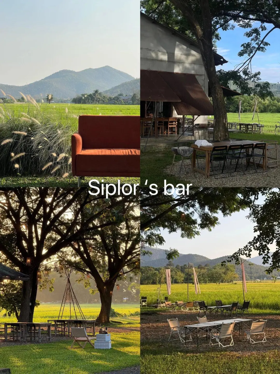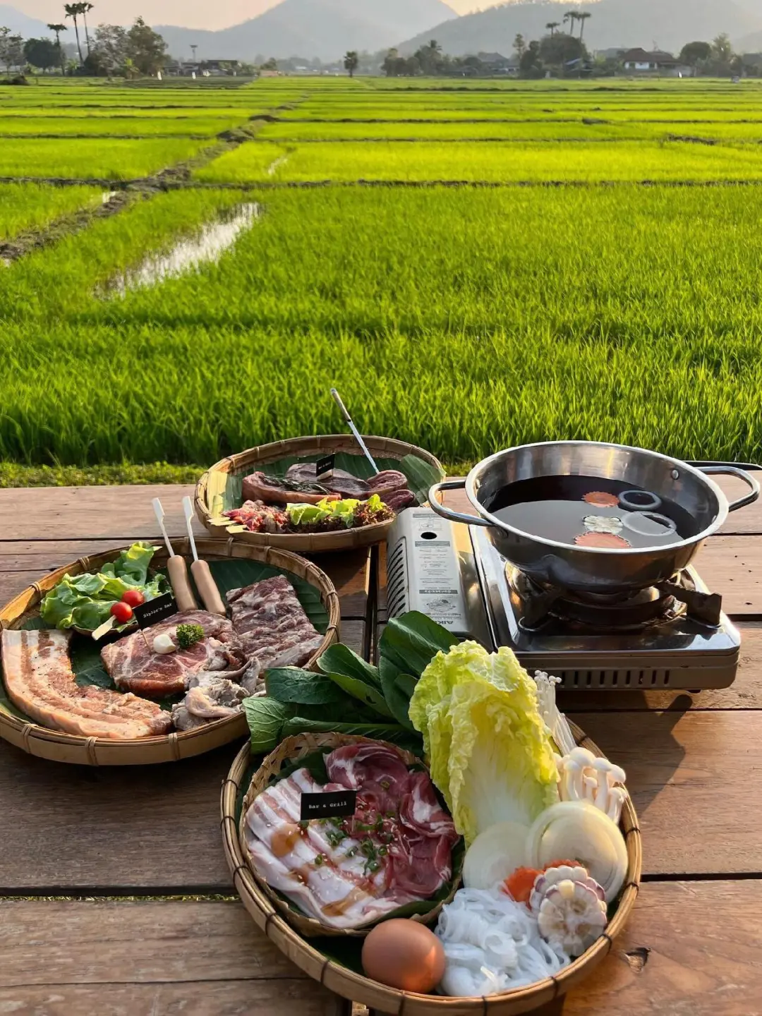 在一片原生态的稻田里面,眼前全是绿色的田野和远处的山峦,提供泰国菜、小火锅和各种饮品