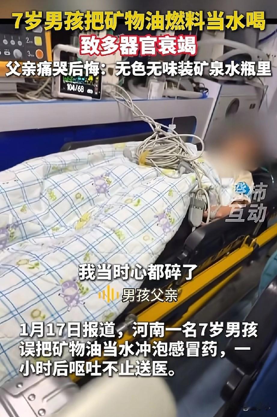 太大意了!河南郸城县,一位爷爷误将火锅燃料喂给孩子喝,导致了孩子多器官衰竭,孩子的父亲哭诉着,天都塌了。 原来孩子父亲的一个朋友开火锅店给的燃料,拿回来吃火锅用,就装在了矿泉水瓶子里面,和矿泉水一样。 7岁的孩子感冒了,爷爷不知情以为是矿泉水,就用了一点加热冲感冒药,孩子第一口喝了没说,然而喝第二口后觉得味道怪怪的就吐了,就告诉了爷爷,爷爷也喝了一口味道不对。 立马就拨打了电话询问儿子,这才得知不是矿泉水,家里人彻底慌了,把孩子送往医院里面急救,但孩子当时已经陷入了昏迷中。 孩子的爸爸一直在责怪自己的大意疏忽,如果孩子真的活不了,自己该怎么办! 很多网友都在指责这位父亲,一个失误就是一辈子,这代价太大了。 看着真的心疼,本该活泼调皮捣蛋的年纪,新年,寒假马上到来了,多开心的日子,却让孩子遭这罪。 如果好了还可以,但如果真的无法救活,父母又该怎么走出来呢?