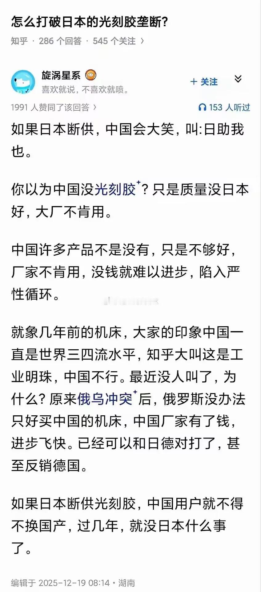 日本声明不会断供光刻胶的供应! 日本也知道咱们国内有自己的光刻胶生产厂家,不过因为价格和质量问题,暂时不能成为主力,所以需要一个机会成长。一旦日本也禁了光刻胶出口到咱们这边,那么国内的光刻胶生产厂家,将会迎来新一轮的爆发期增长。一旦订单多了,用户多,了就可以改进质量,然后迅速一两年之内,达到世界顶尖水平,甚至要超越日本的光刻胶,也不是不可能。 正是因为这样,日本才发现不能断了光刻胶供应,要不然现在断了以后,就再也回不来了,这个是很正常的。就像前几年,日韩有了贸易摩擦,日本就断了韩国的光刻胶供应。结果韩国迅速组织力量,成功的生产出了自己的光刻胶。从此以后,韩国再也不害怕被禁日本的光刻胶了,因为韩国也有自己的光刻胶。 如果日本断了光刻胶供应,那么韩国也可以供应,咱们自己也可以供应。说实话这个产品。并没有什么难度,只是习惯性的采购问题。还有一点,有些人说日本人要断了打火机垫片的供应,那太好了,赶紧断了,就那么个小垫片,只是国内不想生产而已。 就像以前生产圆珠笔芯的钢珠一样,以前是日本和瑞士生产,结果国内那些人总是挑刺,结果太原钢铁炼了一炉圆珠笔钢珠,结果日本的圆珠笔钢珠厂家,再也起不来了。 所以这一次,再也没人说要鼓动光刻胶断供了,因为知道不是光日本有光刻胶,咱们和韩国都有光刻胶,就这么简单。倒是希望日本断了光刻胶供应,但是日本不敢。