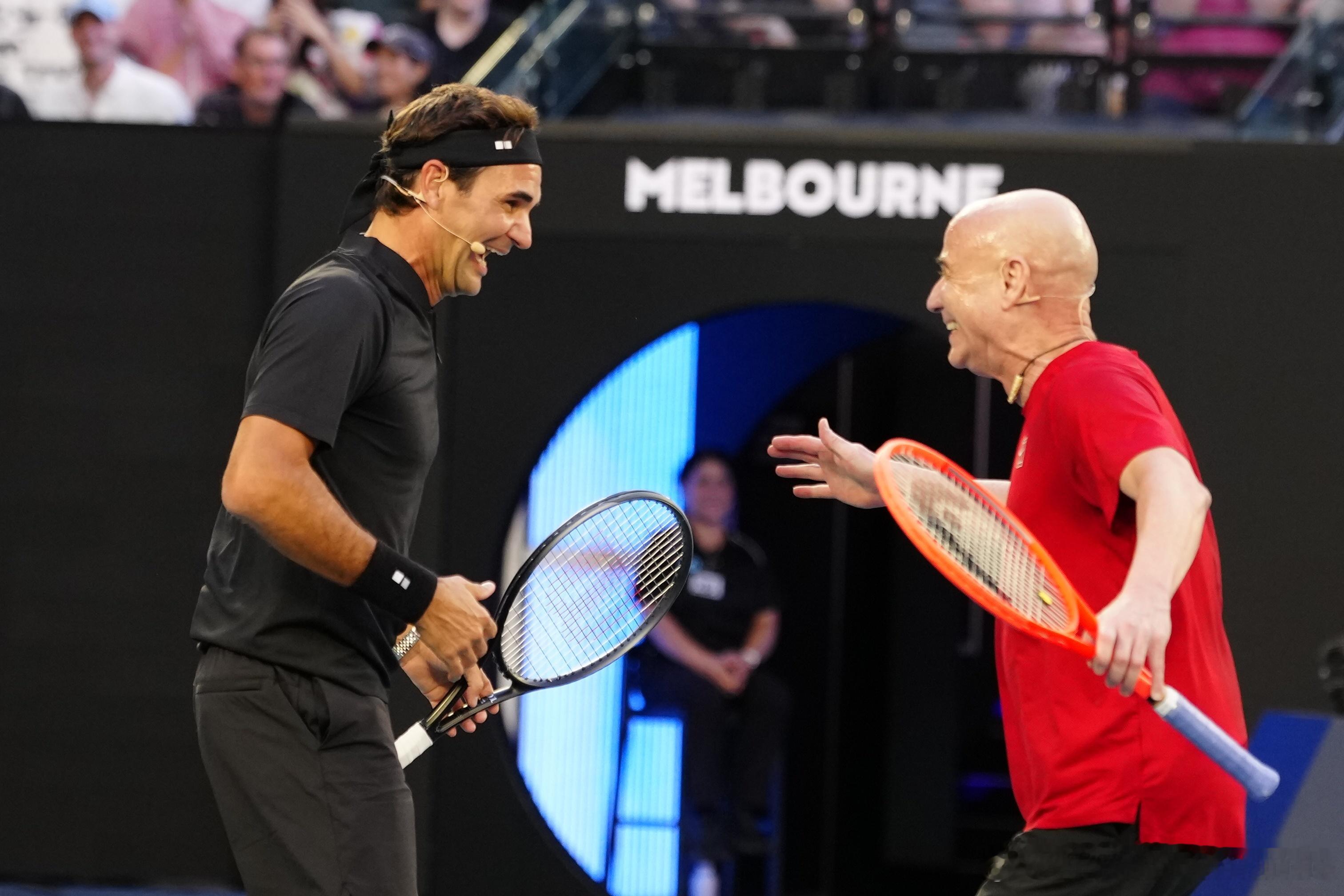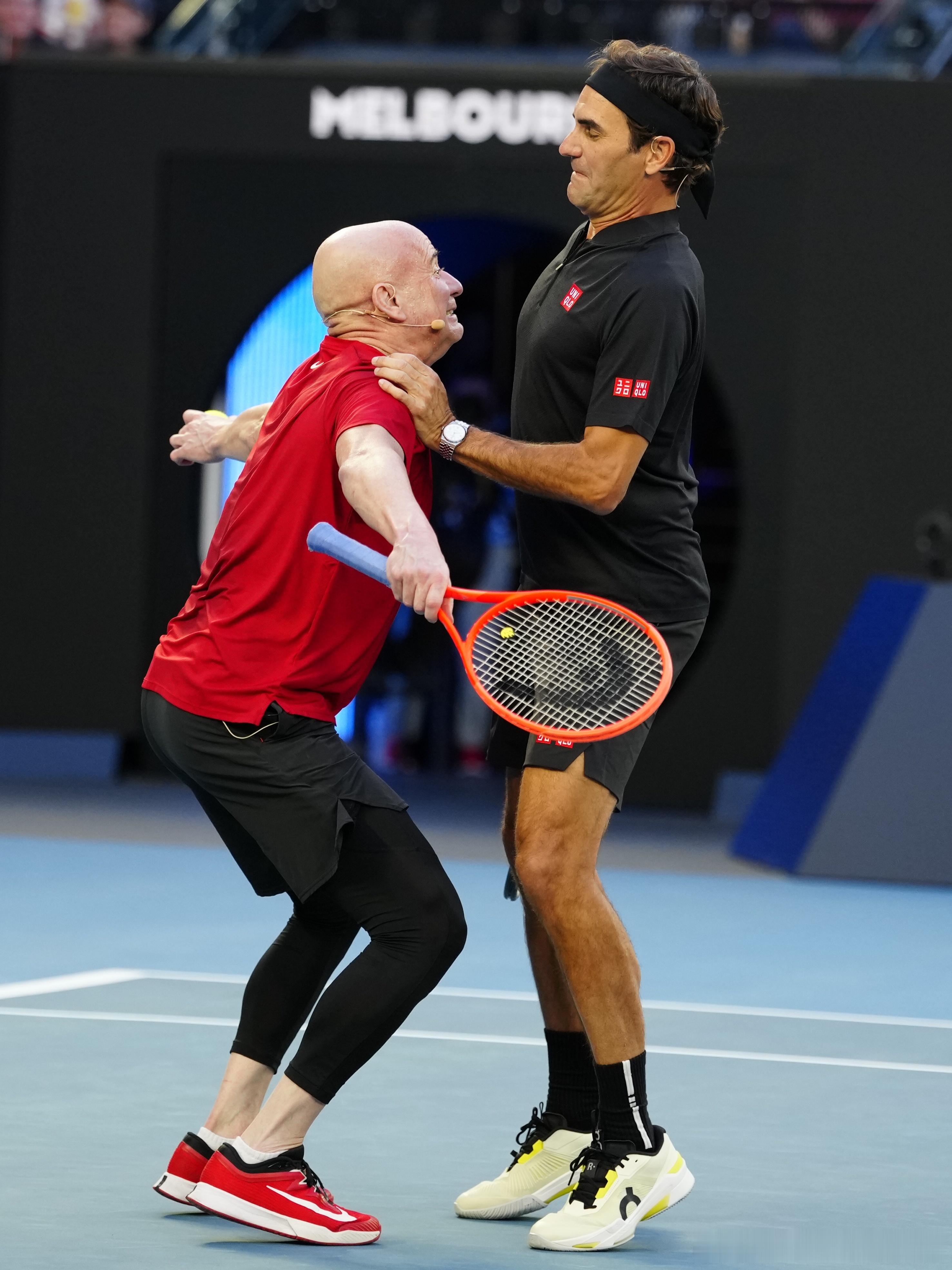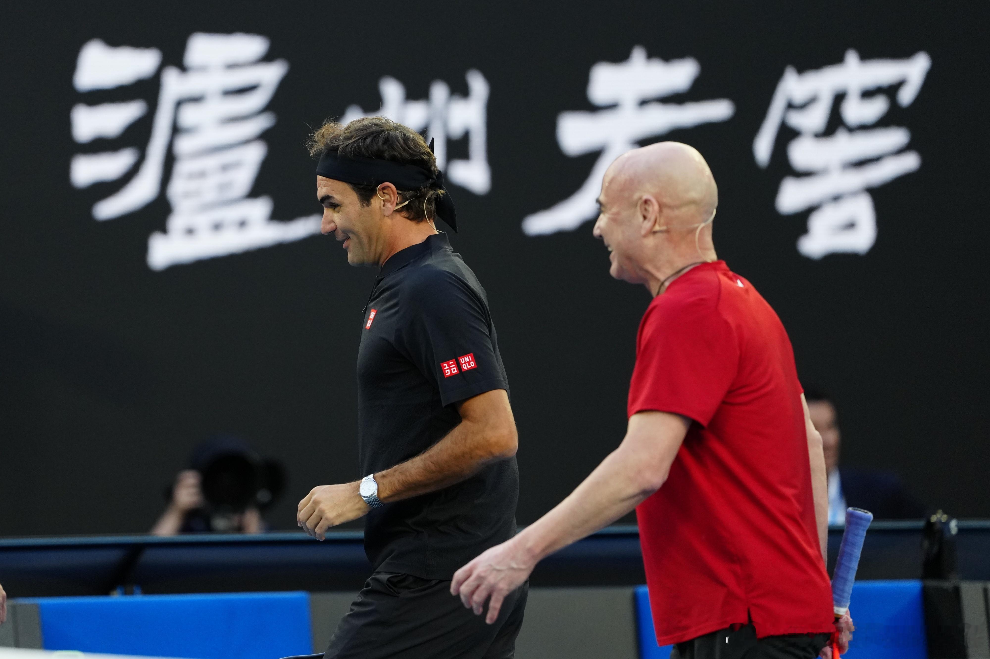 费德勒德约科维奇拥抱费德勒出席澳网开幕式费德勒!阿加西!休伊特!拉夫特!最后第三盘Ash巴蒂也来了!!!几位网坛名宿在罗德拉沃尔中心球场上演的表演赛,很精彩,网坛传统技艺再现!