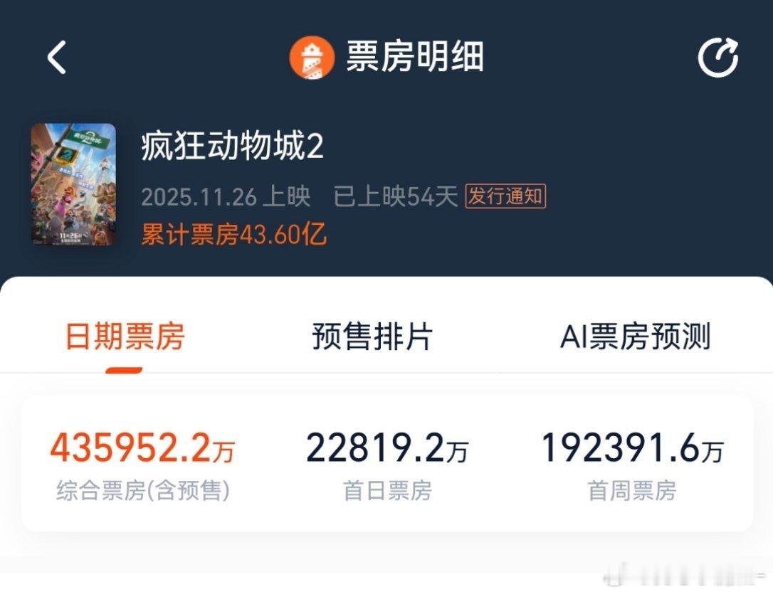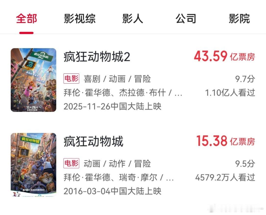 疯狂的动物城2,马上44亿票房了,第一部15亿,翻了几倍,2025年度票房第二(第一哪吒)打败了其余所有国产片,动画片的需求还是挺大的