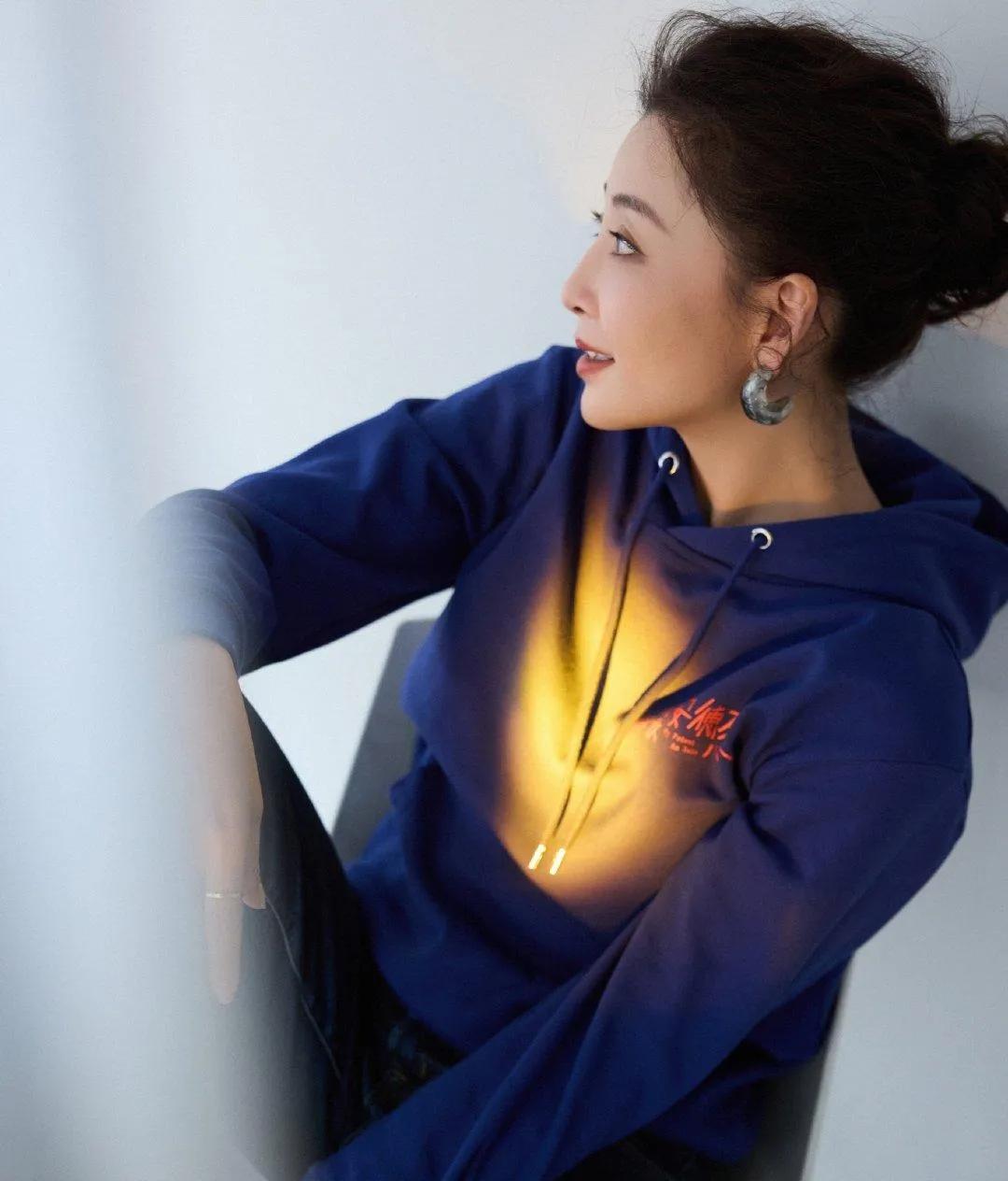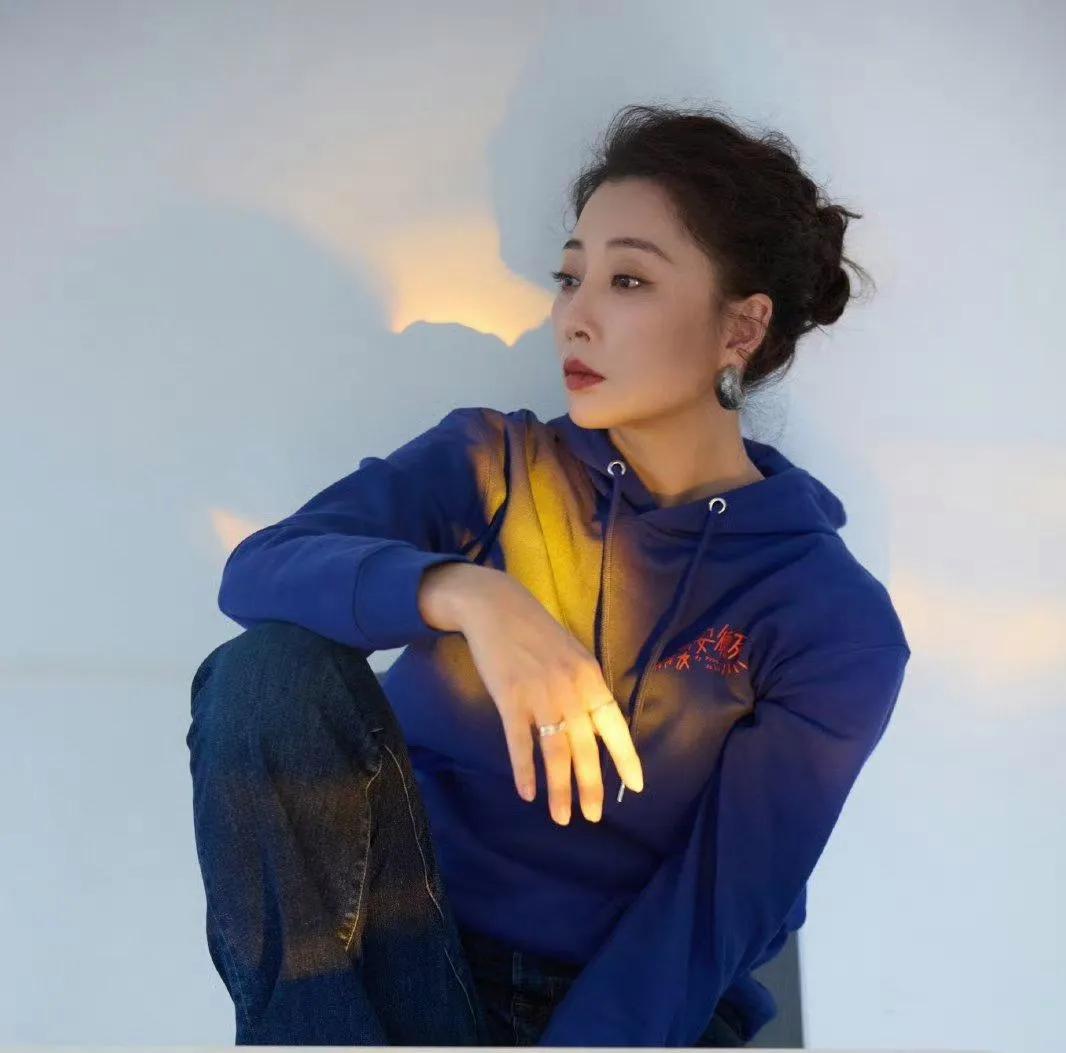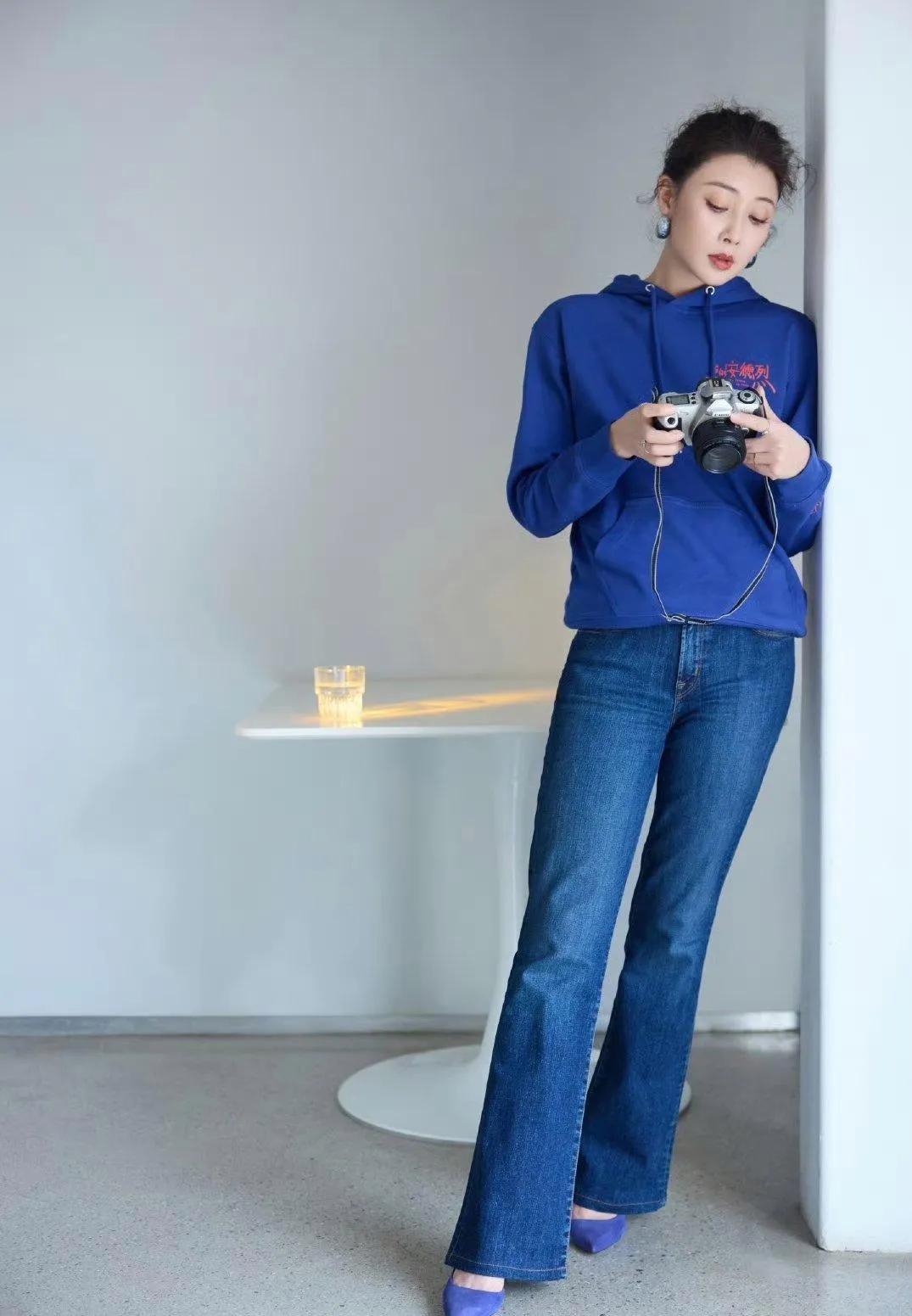 殷桃的状态我太喜欢了!宝蓝卫衣+微喇牛仔裤,松弛温柔又显气质,这才是冻龄女神的正确打开方式~殷桃