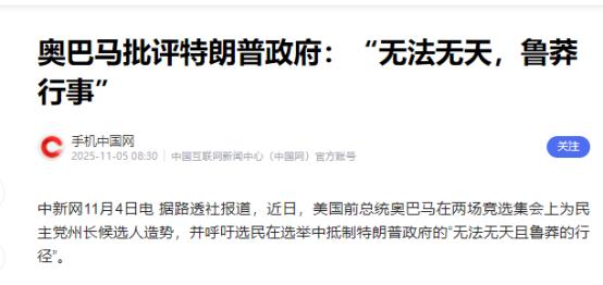 奥巴马忍无可忍,当众怒斥特朗普。 一向低调的美国前总统奥巴马打破政坛禁忌,在一次两州集会上公开炮轰特朗普,用“无法无天”、“鲁莽”、“心胸狭窄”等激烈词汇将其批得一无是处。 2025年11月1日这天,他先去了弗吉尼亚州的一场竞选集会,后来又赶到新泽西州的另一场活动,两场活动里都把矛头对准了特朗普。 之所以会打破这个政坛禁忌,跟2025年的政治形势脱不了关系。那时候正好是美国中期选举的关键阶段,各个州都在为议员席位或者地方重要职位争得厉害。民主党和共和党都想在这次选举里多拿点席位,好掌握更多的政治话语权。弗吉尼亚州和新泽西州就是这轮选举里的关键州,这两个州的选民立场不算固定,有时候投民主党,有时候投共和党,谁能争取到这两个州的支持,对后续的选举结果影响不小。 奥巴马作为民主党前总统,肯定要帮自己党派的人站台。而特朗普作为共和党里的核心人物,一直在为共和党候选人摇旗呐喊,还在政策上给民主党添不少麻烦。这时候奥巴马站出来批特朗普,不只是个人不满,更像是为民主党造势,想让选民看到特朗普的问题,从而更倾向于选民主党。 再说说奥巴马用的那些词,“无法无天”“鲁莽”“心胸狭窄”,这些词可不是随便说的,背后都对应着特朗普的一些做法。比如在政策上,特朗普跟奥巴马时期的很多政策都对着干。奥巴马当总统时,花了不少力气推医保法案,就是想让更多普通美国人能买得起医保、看得起病。可特朗普一直不认可这个法案,好几次想推动修改,甚至要直接废掉。这种做法不仅让之前受益于医保法案的人担心,也让奥巴马觉得特朗普太不顾及普通人的利益,做事太鲁莽,一点不考虑政策变动带来的影响。 还有移民政策,奥巴马时期对移民相对宽容,还推出过保护幼年非法移民的政策。但特朗普上台后,搞过严格的移民限制,甚至有过分离移民家庭的做法。这种政策不仅引发了社会争议,还让很多人觉得太没人情味。奥巴马可能觉得这种做法不符合美国一直宣扬的包容精神,而且推行过程中没少绕过正常的政策讨论流程,有点无法无天的意思。 在处理政治分歧上,特朗普的风格也比较强硬,对反对自己的声音没什么耐心,经常公开批评反对者,甚至用一些不太得体的话攻击对手。这在奥巴马看来,就是心胸狭窄的表现。美国政坛虽然两党经常吵架,但传统上还是讲究点互相尊重,就算有分歧,也不会把矛盾闹得太难看。可特朗普的做法打破了这种默契,让两党之间的对立越来越严重,这也是奥巴马不满的地方。 另外特朗普在2025年的影响力还不小,不光在共和党内部说一不二,还能影响不少选民的想法。如果奥巴马不站出来发声,民主党在这两个关键州的竞选可能会处于下风。毕竟奥巴马在民主党选民里还有很高的号召力,他亲自出来批特朗普,能调动更多民主党支持者的积极性,也能让中间选民注意到特朗普政策里的问题。 而且奥巴马之前一直保持低调,就算对特朗普的政策有意见,也很少公开撕破脸。这次突然变得这么激烈,说明他觉得当前的情况已经不能再忍了。要么是特朗普的政策已经给美国社会带来了明显的分歧,要么是共和党在选举中的势头太猛,民主党必须拿出更有力的办法来应对。所以他才会打破多年的政坛惯例,冒着被说“干预当下政治”的风险,公开炮轰特朗普。 总的来说奥巴马这次的做法不是一时冲动,而是结合了2025年的选举形势、两党政策分歧以及特朗普的个人风格做出的选择。他用那些激烈的词汇,既是表达自己的不满,也是为了给民主党争取更多支持,同时打击特朗普和共和党的势头。这种打破禁忌的行为,也从侧面反映出当时美国两党之间的竞争已经到了比较激烈的程度,连前总统都不得不亲自下场参与进来。