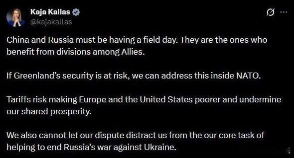 卡拉斯称中俄肯定乐坏了,北约内部可以解决格陵兰岛问题。关税将使欧美变得更穷,不能分散结束俄乌战争这一核心任务的注意力来源:kajakallas特朗普因格陵兰岛向欧洲8国加税特朗普回应是否抓捕普京 俄乌局势新进展