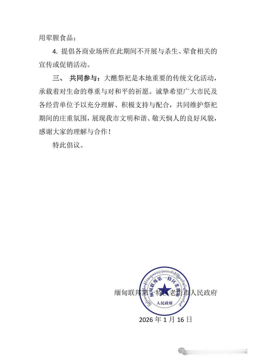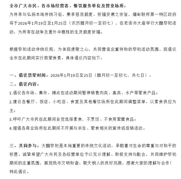 久缅北果敢地区要实行禁荤食素! 时间跨度:2026年1月19日至25日,这七天
