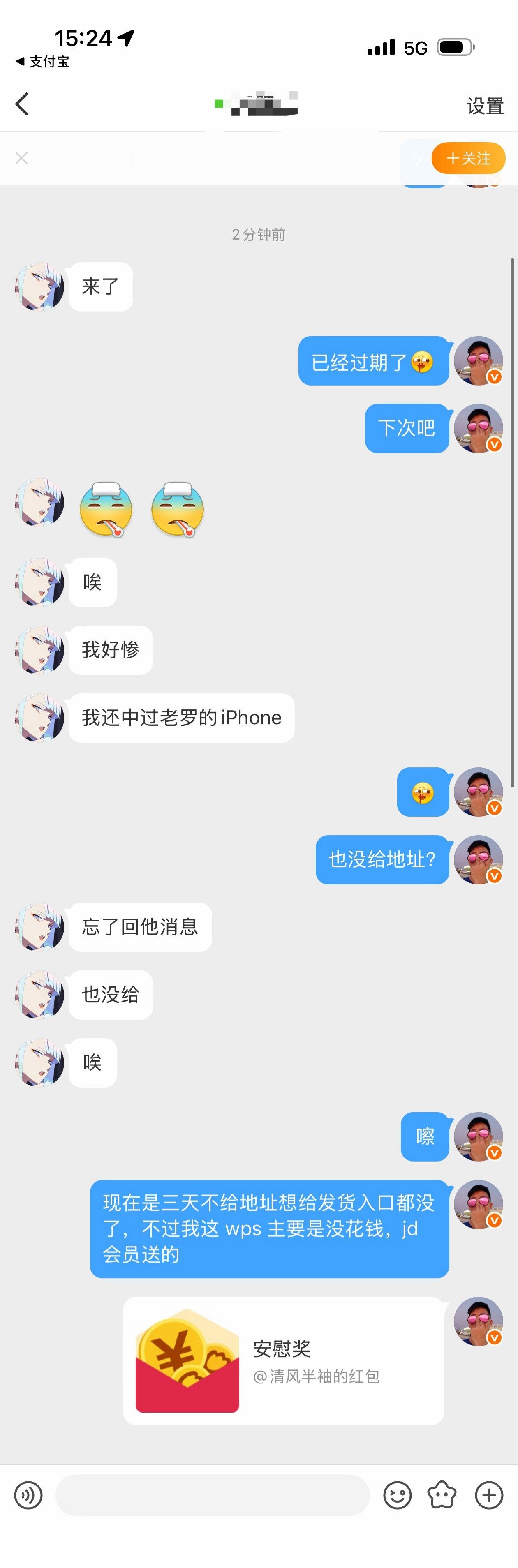 上次中 wps 会员的朋友因为没给地址和手机号作废了,我发了个安慰奖。不过最惨的是这哥们说以前中过老罗的 iPhone,也没给地址。