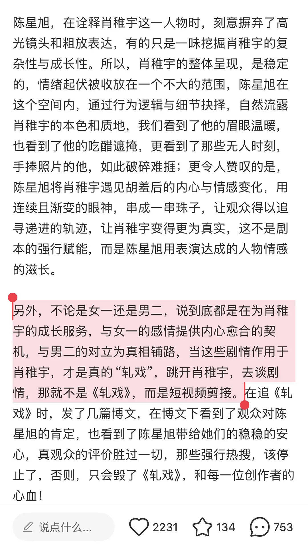 兴许丝是怎么好意思说这段话的啊?女主男二都是为男主的成长服务,跳开男主就不是轧戏,而是短视频拼接???一部女频现偶这些话说出来不离谱么??这是从上到下,从制片到演员到粉丝都真心觉得女频爆改大男主这事特正常甚至可以拿出来夸,超自信觉得大男主改编超级厉害播后陈星旭🐃:我才不是桌子 kol跟粉丝:看切片的都不是观众!看正片就不可能喜欢男二不可能嗑男二跟女主,只会嗑男女主!