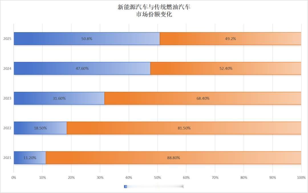 1月14日,中国汽车工业协会交出重磅数据:2025年我国新能源汽车产销量均突破1600万辆,国内新车销量占比超50%,这是新能源车首次在年度销量中超越燃油车,标志着我国汽车市场正式进入“新能源主导”时代。 数据说话:每两辆新车就有一辆是新能源 此次突破并非偶然。数据显示,新能源车占比从不足10%到过半,仅用了不到6年时间。这意味着,2025年消费者买新车时,选择新能源的概率已超过燃油车,汽车市场“油电争霸”的格局,以新能源车的胜利画上关键一笔。 市场变天:燃油车遇冷,新能源车成“香饽饽” 随着充电设施完善、续航技术升级,新能源车的“痛点”逐渐化解,而省钱、智能的优势愈发突出:同等使用强度下,新能源车年成本仅为燃油车的1/3,智能驾驶、语音控制等配置更是成为标配。 反观燃油车市场,昔日“刚需”标签褪色,部分车型降价促销仍难挽颓势。有经销商调侃:“以前燃油车展厅门庭若市,现在来咨询的大多是问‘有没有混动版本’。” 行业影响:交通用能结构迎“大转型” 此次销量反转,不止是汽车市场的内部洗牌,更意味着我国交通用能结构迈入新阶段。新能源车的普及,将进一步拉动绿色电力需求,同时给传统能源行业带来新的挑战与机遇。 从“油车为主”到“电车当道”,这场变革来得又快又猛。对于消费者而言,选择更多元;对于行业来说,转型已不可逆。接下来,燃油车能否“逆风翻盘”?新能源车又将交出怎样的答卷?值得持续关注。【来自懂车帝车友圈】