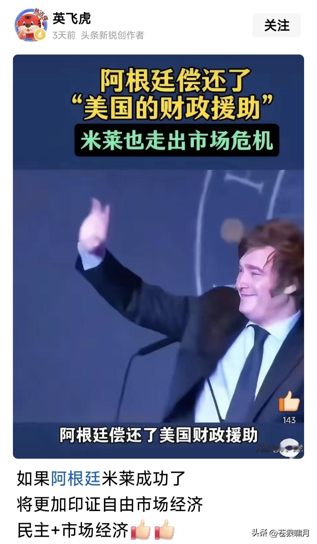 米莱上台大刀阔斧改革,一年时间竟使国家财政由亏转盈,不但让阿根廷走出经济危机,还偿还了美国援助款! 米莱全面改革成功,再次证明市场经济活力无限!市场经济核心是什么?就是民主法治+自由竞争,在法治框架与保障下,充分激发企业家创造精神! 其实中国改革开放的成果,也是学习发达国家市场经济管理经验,充分激发企业家创造精神成功范例。企业家无创新创造精神,经济能跨越式发展吗? 阿根廷原是富裕国家,却与中国走了相反道路!上世纪80年代搞国家干预,市场转向国有,结果每况愈下,高福利致债台高筑,经济面临崩溃边缘。 可以说是米莱上台,大刀阔斧搞改革!国有回归市场化,激发企业创造力;大幅精简机构,节省财政开支,双管齐下取得成绩,给世界上了生动一课! …………