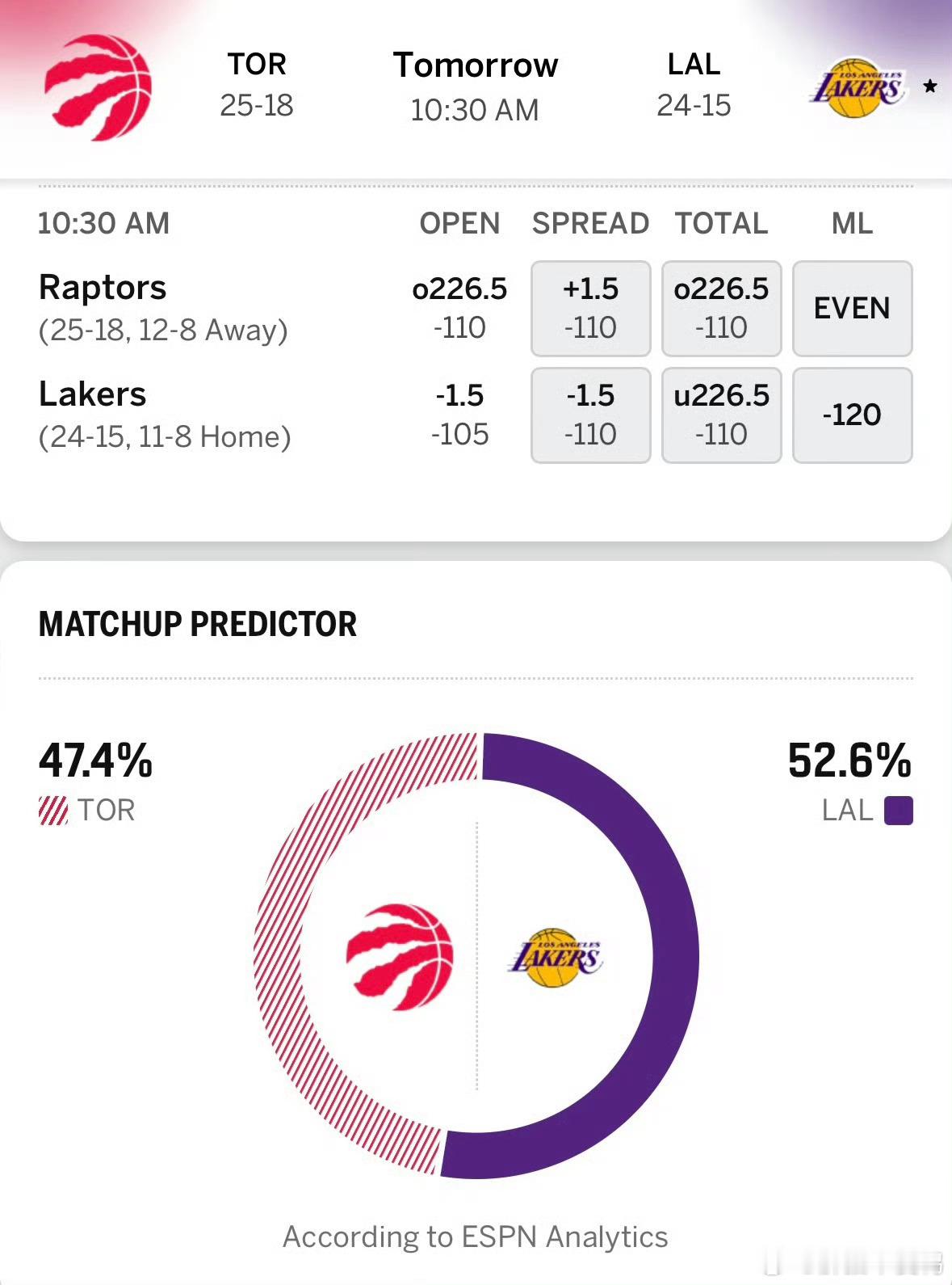湖人猛龙明日比赛预告!三连败要来了!ESPN明天预测湖人胜率居然还有52.6%!而猛龙是47.4%!双方此前一番战,八村三分绝杀!湖人这边,今天打开拓者以16分惨败!目前两连败趋势!湖人最近真的无话可说,近6战5败!教练也有原因,球员也原因!还有伤病!湖人目前正在经历一波伤病潮,基本就是一人复出一人伤退!今天开拓者,明显受伤病影响很大,两大中锋伤缺,东子也没打,进攻火力跟篮板完全劣势!猛龙这边,上一场惜败快船4分,本赛季东部黑马之一,锋线大队!巴恩斯本赛季也进步了,而英格的加盟是彻底改变猛龙的关键因素!且猛龙的防守效率很高,又是全联盟最会分享球的球队之一!上一场也是跟快船鏖战至加时,无奈球星成色略输快船才遭惜败,明天能否复仇湖人?双方近5战及总战绩:湖人1胜4负,24胜16负猛龙2胜3负,25胜18负双方预测首发:湖人-东子,拉拉,艾顿,文总,老詹猛龙-英歌,巴恩斯,谢德,阿巴吉,博伊尔斯伤病名单:湖人—詹姆斯(关节炎、坐骨神经痛)、艾顿(左膝)、海斯(腿筋)、东契奇(腹股沟)出战成疑!里夫斯(小腿拉伤)、蒂耶罗(韧带扭伤) 缺席!猛龙—巴特尔(脚踝)、奎克利(背部痉挛)出战成疑!RJ巴雷特(脚踝)、赫本(脚踝)、波尔特尔(背部)、沃尔特(指状损伤)缺席!攻防对比:湖人进攻8,防守26猛龙进攻18,防守5湖人洛杉矶湖人詹姆斯湖人国度