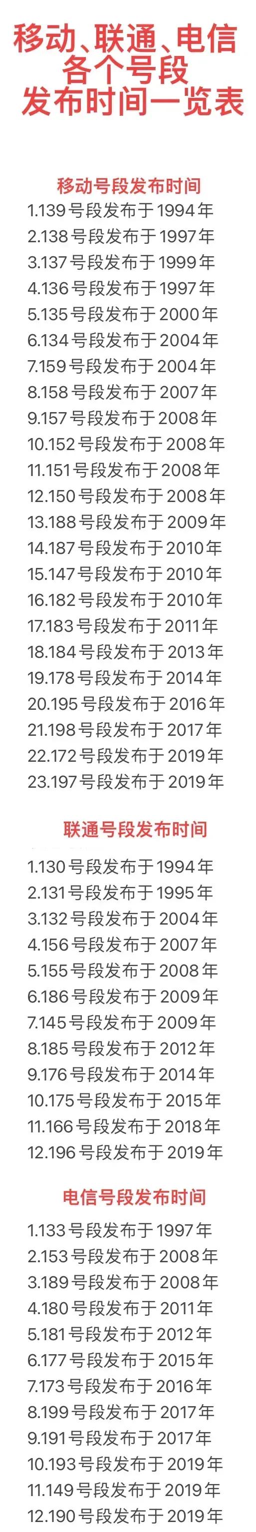 你的手机号几岁了? 看一个手机号的年龄,只需要看前三位就够了。 就像移动的139,联通的130,电信的133,一看就知道是手机的资历王者。 大多意味着在手机没有普及的时候,就已经拥有了手机这个神器。 而现在号段越来越多了。 除了那些古董号段,最好的号段大约就是166、188、199之类的。 不过我想说的是,手机号只是身外之物而已,没有必要追求炸弹号或者豹子号。 很多时候如果能拥有一个跟自己生日相同的号码,就已经非常幸运了。
