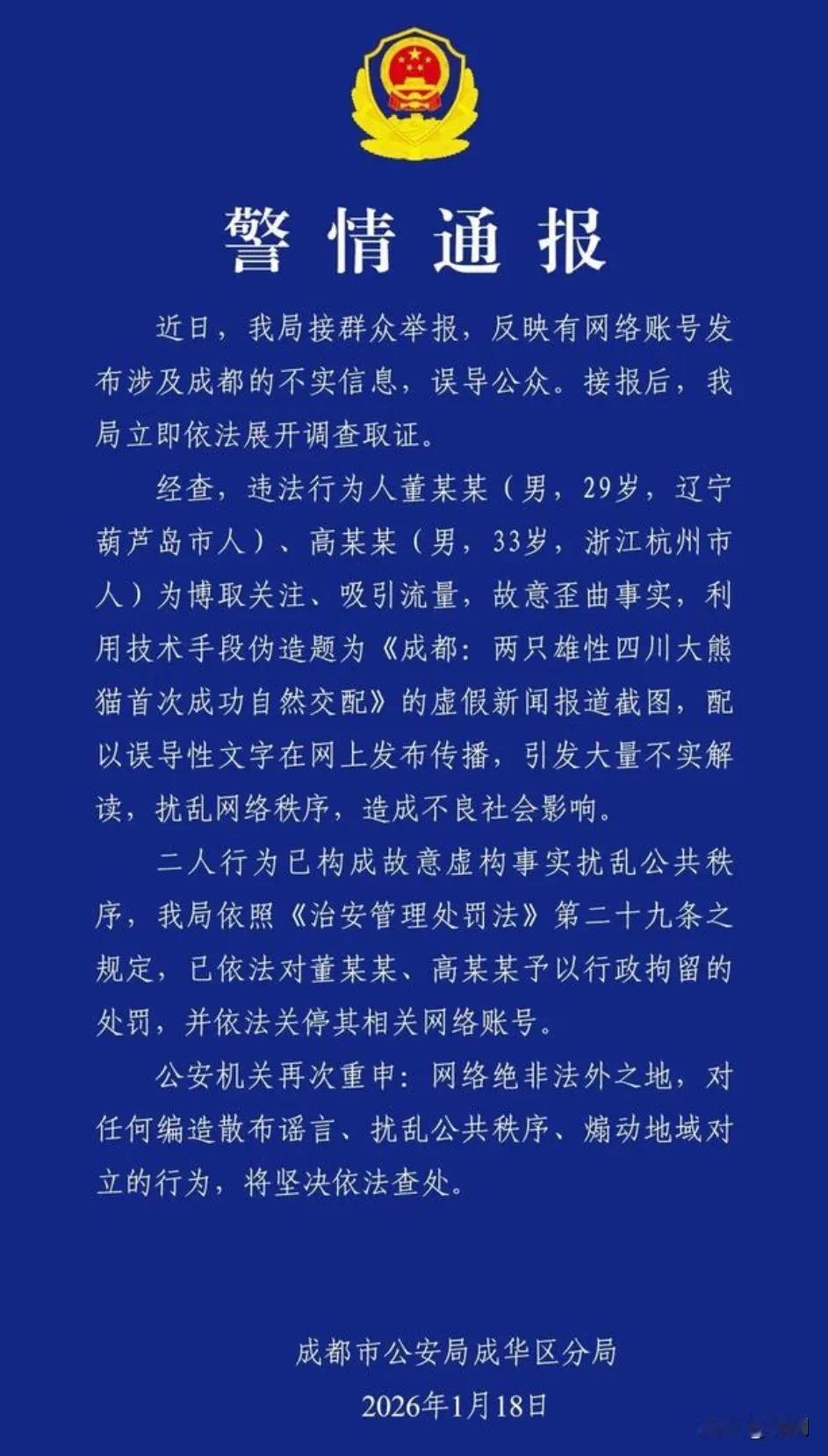 成都警方重拳出击,连续三天三个区处理三起“诋毁造谣抹黑”成都城市形象的网民,多人被刑事拘留和行政拘留。1月16日17日18日三天,高新区、武侯区、成华区警方,分别对抹黑成都而故意在网络平台发布关联成都的“同性恋”、“吸阳气”、“两只雄性大熊猫交配”等捏造事实的视频。 此行为严重诋毁和损害了成都3000万市民的形象,还成都文旅造成重大不良后果。警方依法对这些视频发布者进行了处罚,并会同网络平台封禁账号。警方同时提醒其他有历史发布转载者,尽快删除,网络不是法外之地,上网创作一定要遵纪守法。 成都警方近期重拳整治网络抹黑成都“同性恋”的谣言