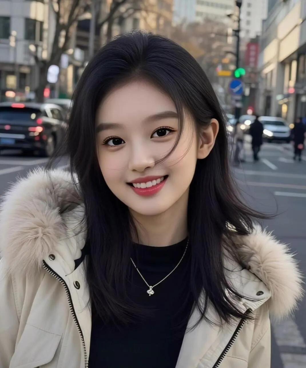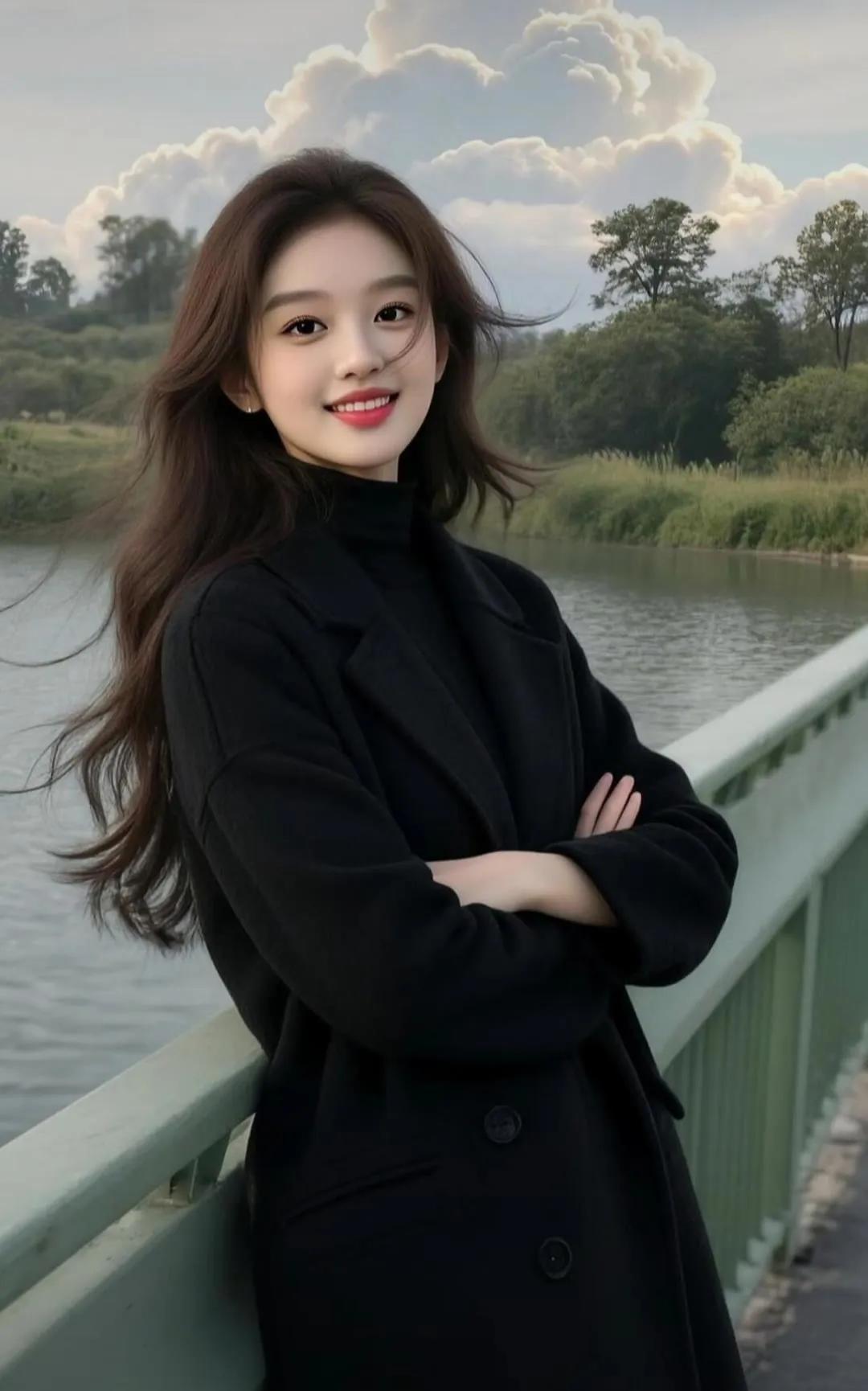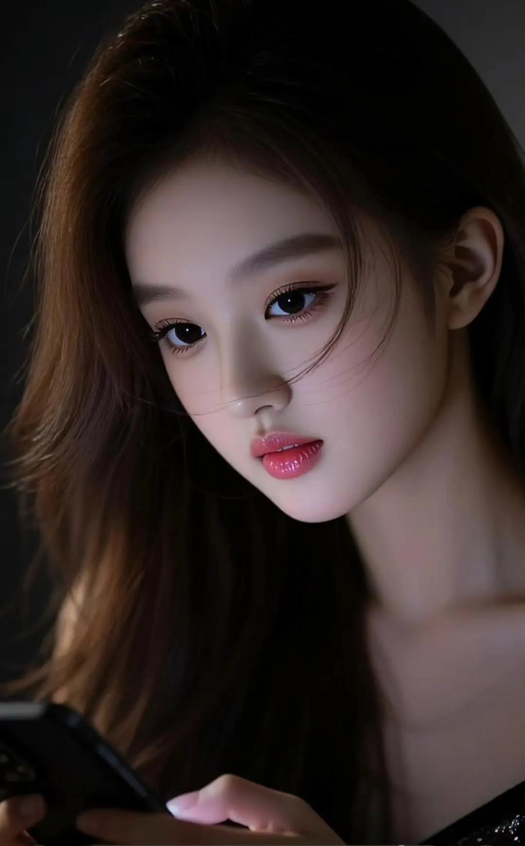 甜美少女,黑发红唇,简约优雅,气质出众。