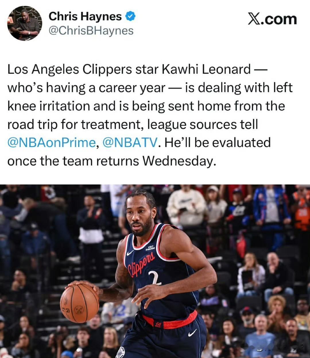 还是没躲过去!!!伦纳德退出客场之旅,回洛杉矶接受治疗! 根据记者Chris Haynes最新消息透露,快船当家球星伦纳德遭遇了左膝盖伤病,他选择退出这波客场之旅,回到洛杉矶接受治疗! 看来还是没能躲过去,估计这一波下来后面又得缺阵很多比赛了,一点期望都不能过多的去想,怕什么来什么。 快船计划在打完周三和公牛的比赛,回到洛杉矶以后再对伦纳德的伤病进行评估,周五他们将在主场迎战同城的湖人队。 外界似乎都已经接受了伦纳德的这种状态,毕竟他这状态已经持续不少赛季了,还是希望小卡能够早日康复,季后赛关键时刻还是需要他站出来的。 快船队 快船 伦纳德 莱昂纳德
