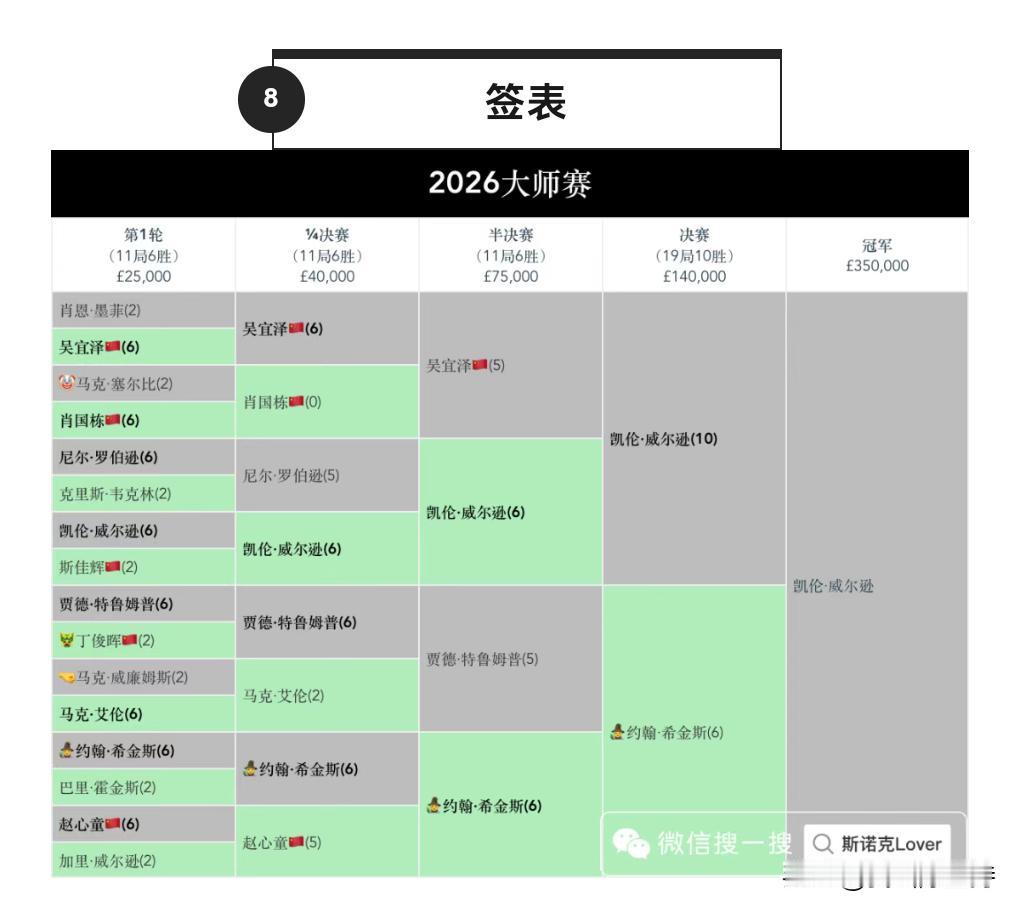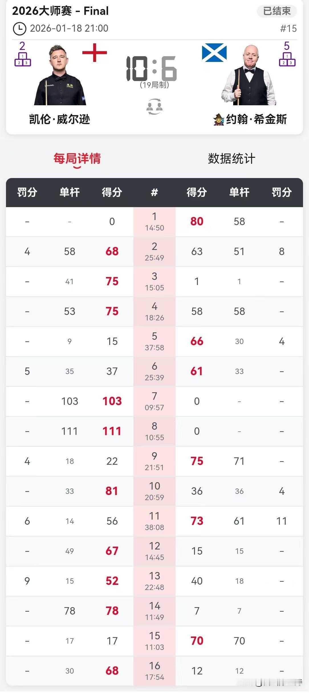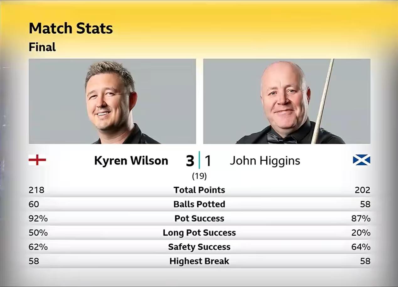大师赛,凯伦威尔逊3进决赛,最终捧得冠军奖杯,大满贯听牌英锦赛。 18年决赛,凯伦7-10不敌艾伦,哭的像个小女孩。 去年决赛,凯伦7-10不敌墨菲。 今年10-6战胜希金斯,终于得偿所愿。 对阵希金斯,凯伦在第一第二个阶段,分别打出5-3获胜。 看看凯伦晋级之路,首轮6-2击败斯佳辉,然后两个6-5击败罗伯逊和吴宜泽,都是最后两盘获胜,展示强大心脏。 凯伦赛后表示,自己换了新的球杆,现在已经很相信这支球杆了。英锦赛首轮输球后,一度怀疑自己还能不能再拿冠军,现在已经没有这个问题了。 看了凯伦几场比赛,确实有幸运致胜眷顾,罗伯逊和吴宜泽简单球不进,让他死里逃生。不过最后阶段确实打得非常强硬。 大师赛单杆最高级是吴宜泽的137分,收获1.5万英镑,也还不错。 今天继续打的比赛是冠军联赛。