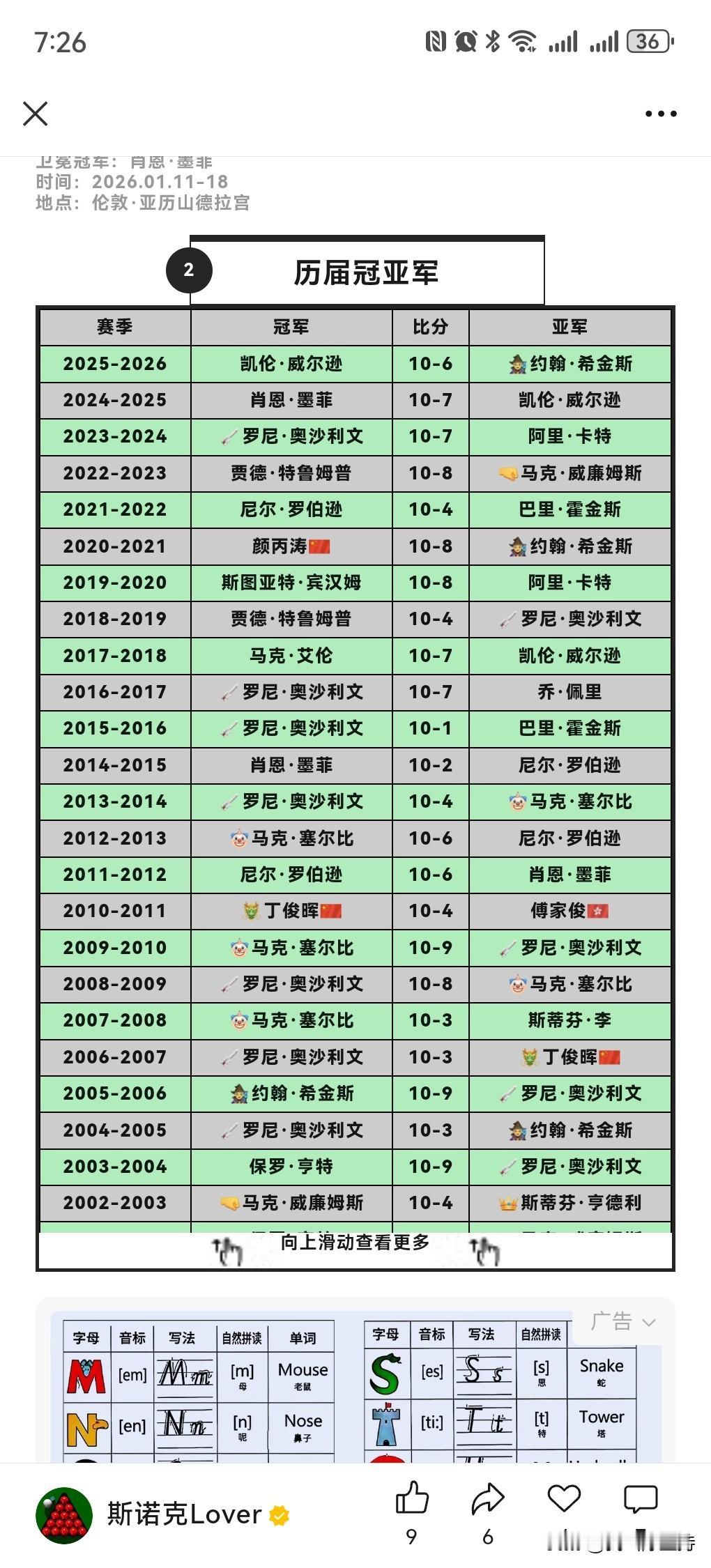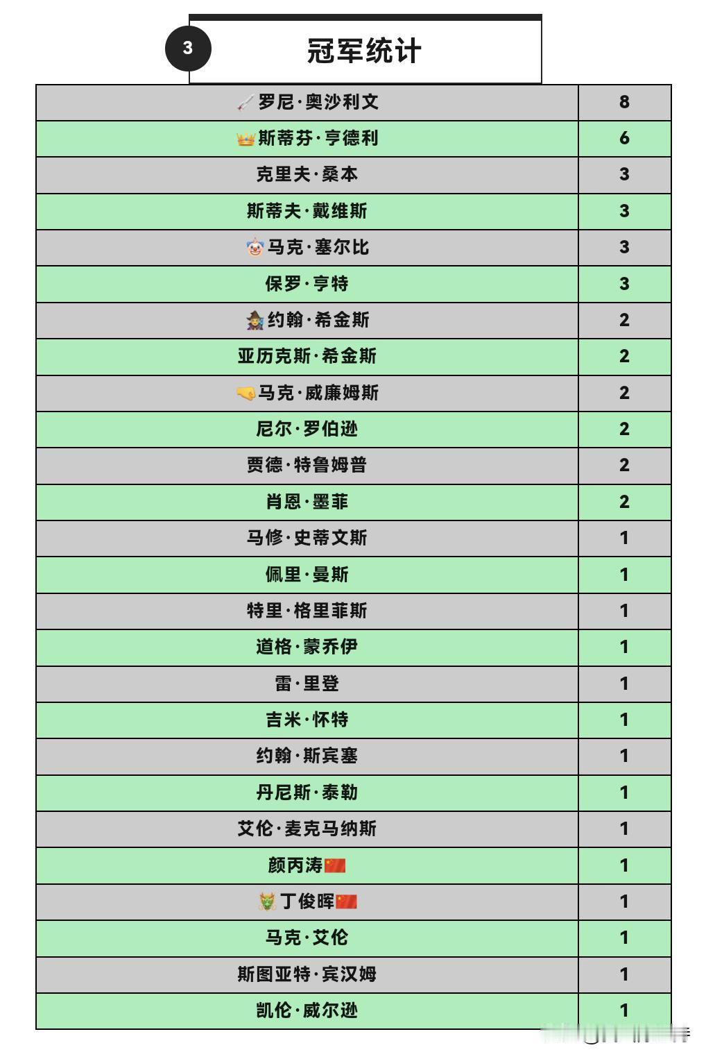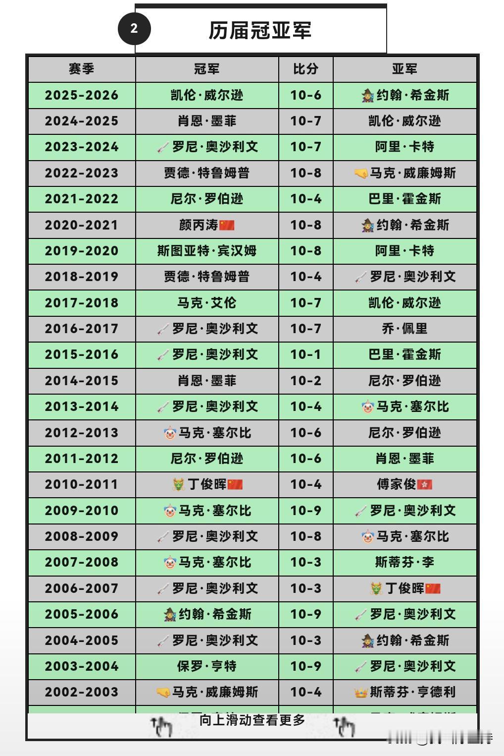 大师赛,凯伦威尔逊3进决赛,最终捧得冠军奖杯,大满贯听牌英锦赛。 18年决赛,凯伦7-10不敌艾伦,哭的像个小女孩。 去年决赛,凯伦7-10不敌墨菲。 今年10-6战胜希金斯,终于得偿所愿。 对阵希金斯,凯伦在第一第二个阶段,分别打出5-3获胜。 看看凯伦晋级之路,首轮6-2击败斯佳辉,然后两个6-5击败罗伯逊和吴宜泽,都是最后两盘获胜,展示强大心脏。 凯伦赛后表示,自己换了新的球杆,现在已经很相信这支球杆了。英锦赛首轮输球后,一度怀疑自己还能不能再拿冠军,现在已经没有这个问题了。 看了凯伦几场比赛,确实有幸运致胜眷顾,罗伯逊和吴宜泽简单球不进,让他死里逃生。不过最后阶段确实打得非常强硬。 大师赛单杆最高级是吴宜泽的137分,收获1.5万英镑,也还不错。 今天继续打的比赛是冠军联赛。