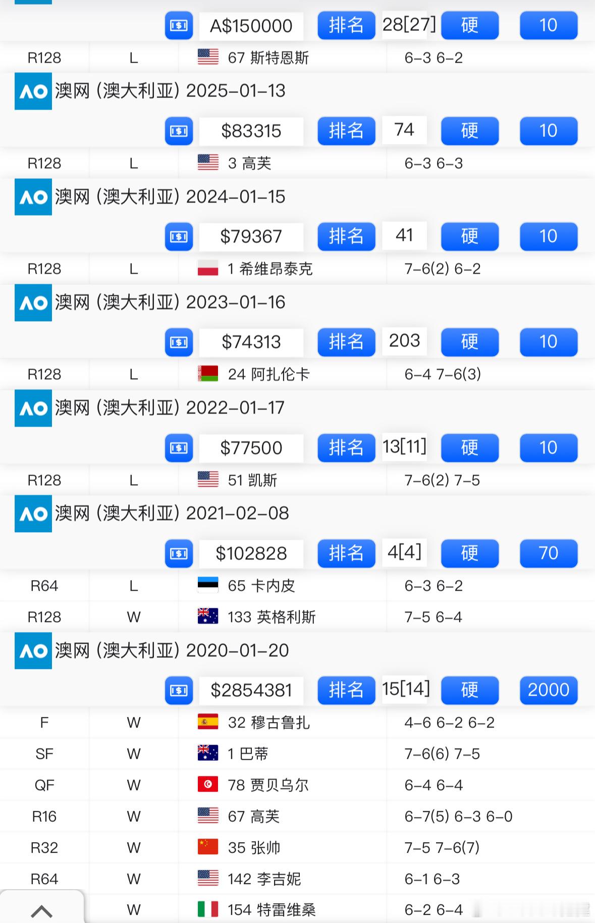 肯宁好惨!2020澳网夺冠后在澳网只取1胜,遭遇六连败(连续五年一轮游),她最近两个大满贯都是一轮游。她澳网战绩:2018首轮2019次轮2020冠军2021次轮2022首轮2023首轮2024首轮2025首轮2026首轮这很澳网澳网2026