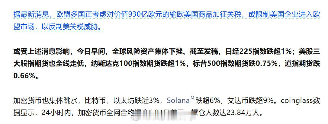 【全球风险资产集体下挫】加密货币集体大跳水了据最新消息,欧盟多国正考虑对价值930亿欧元的输欧美国商品加征关税,或限制美国企业进入欧盟市场,以反制美关税威胁。或受上述消息影响,今日早间,全球风险资产集体下挫。截至发稿,日经225指数跌超1%;美股三大股指期货也全线走低,纳斯达克100指数期货跌超1%,标普500指数期货跌0.75%,道指期货跌0.66%。加密货币也集体跳水,比特币、以太坊跌近3%,Solana跌超6%,艾达币跌超9%。coinglass数据显示,24小时内,加密货币全网合约爆仓6.84亿美元,爆仓人数达23.84万人。(券商中国)