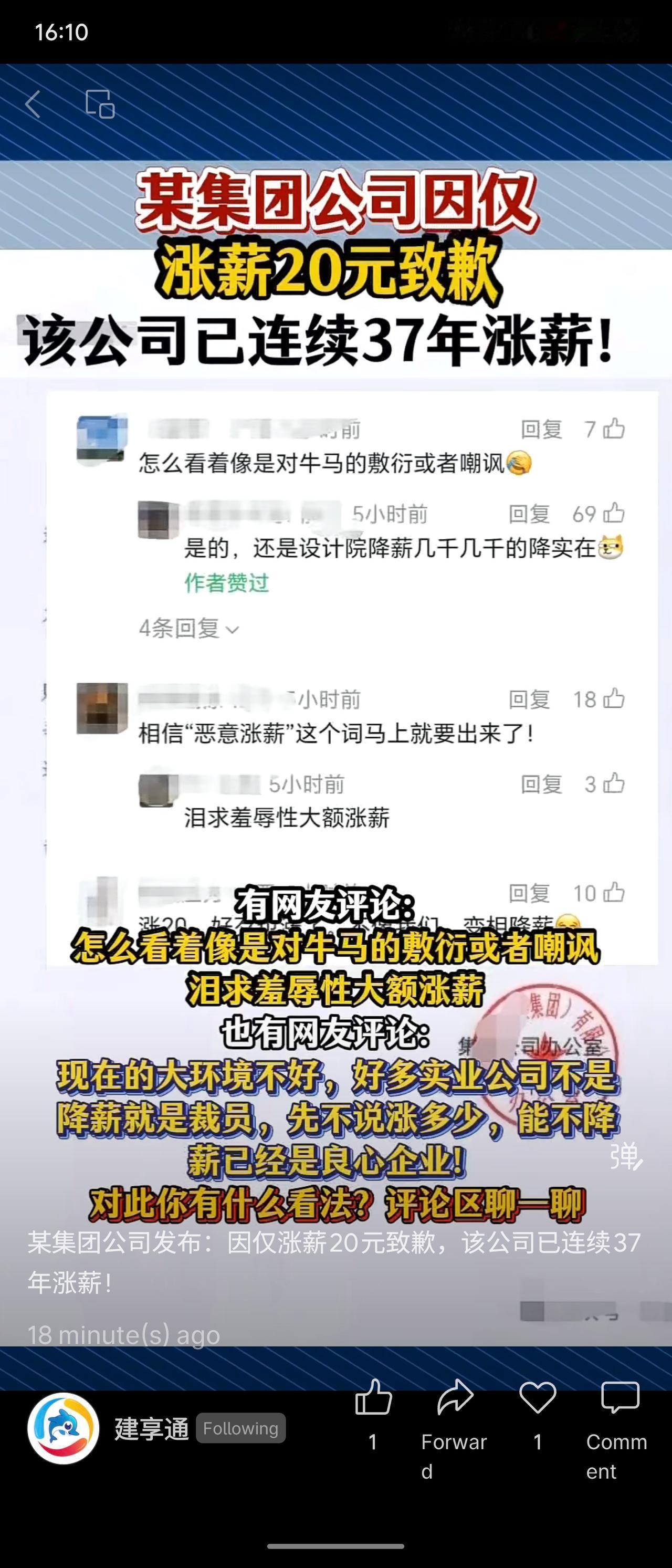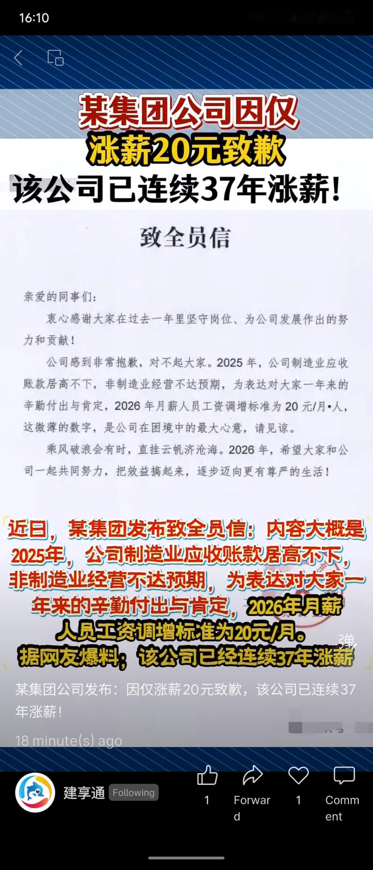 某集团公司因经营困难,2026年月薪人员仅调增20元,并发信致歉。该公司已连续37年保持涨薪记录。网友对此反应不一:有人认为这是敷衍,也有观点认为当前环境下不降薪已属不易。