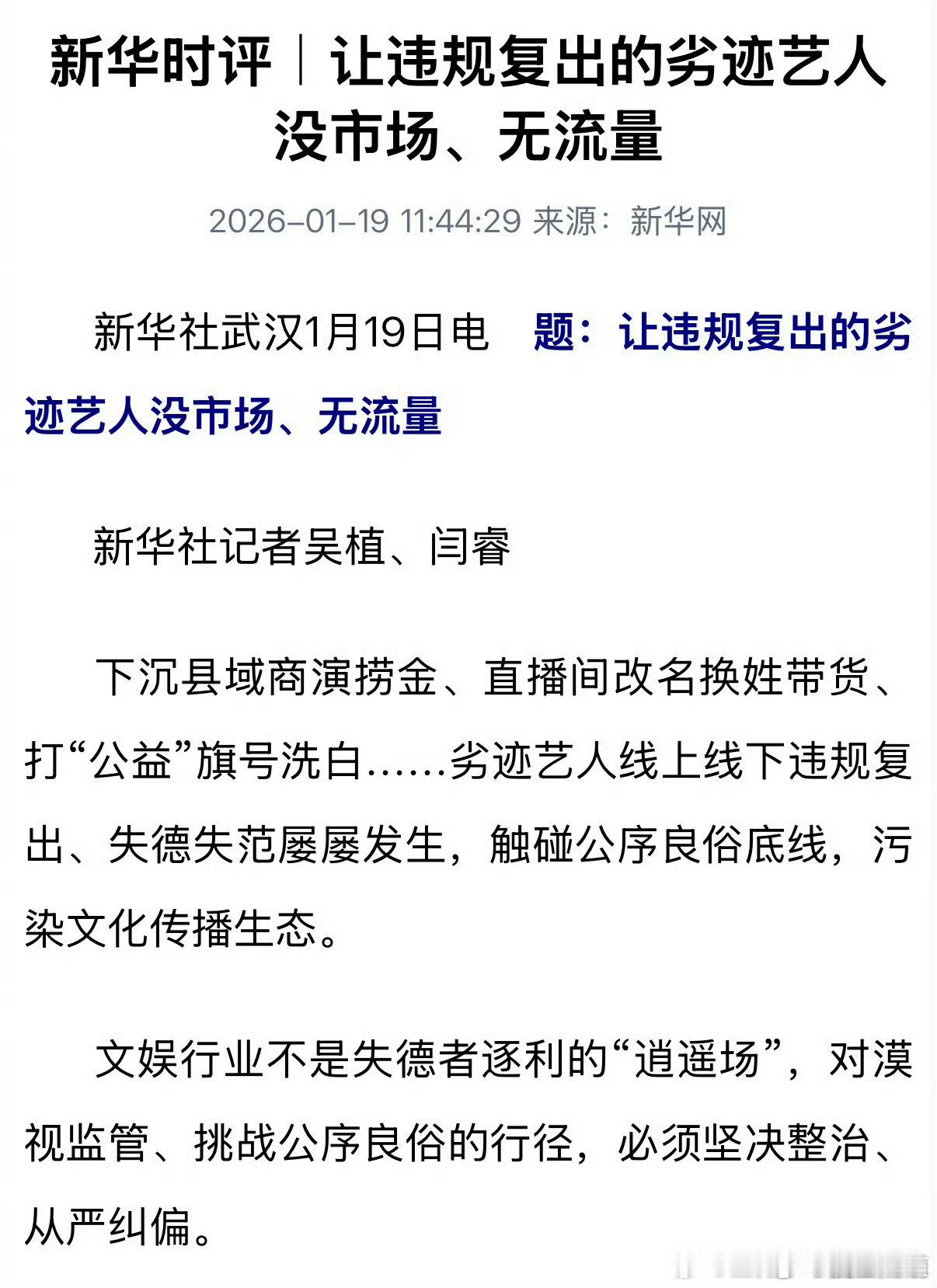 新华网发文:让违规复出的劣迹艺人没市场、无流量! 能不能把用氵菌控制舆论的劣迹艺人封杀一下先