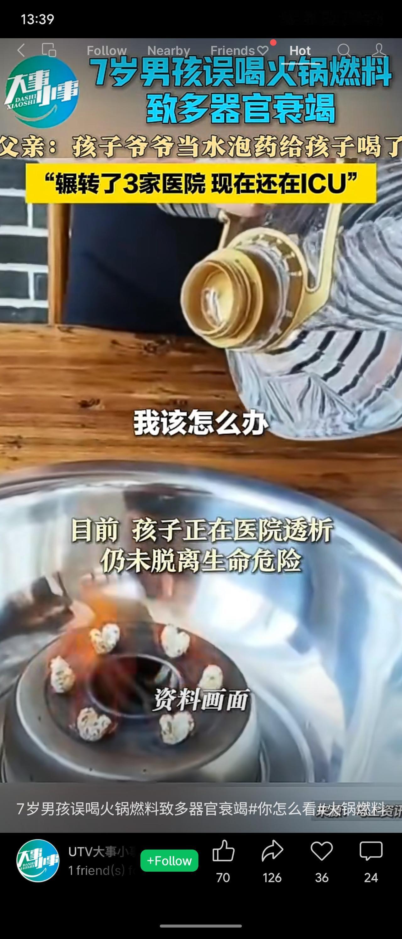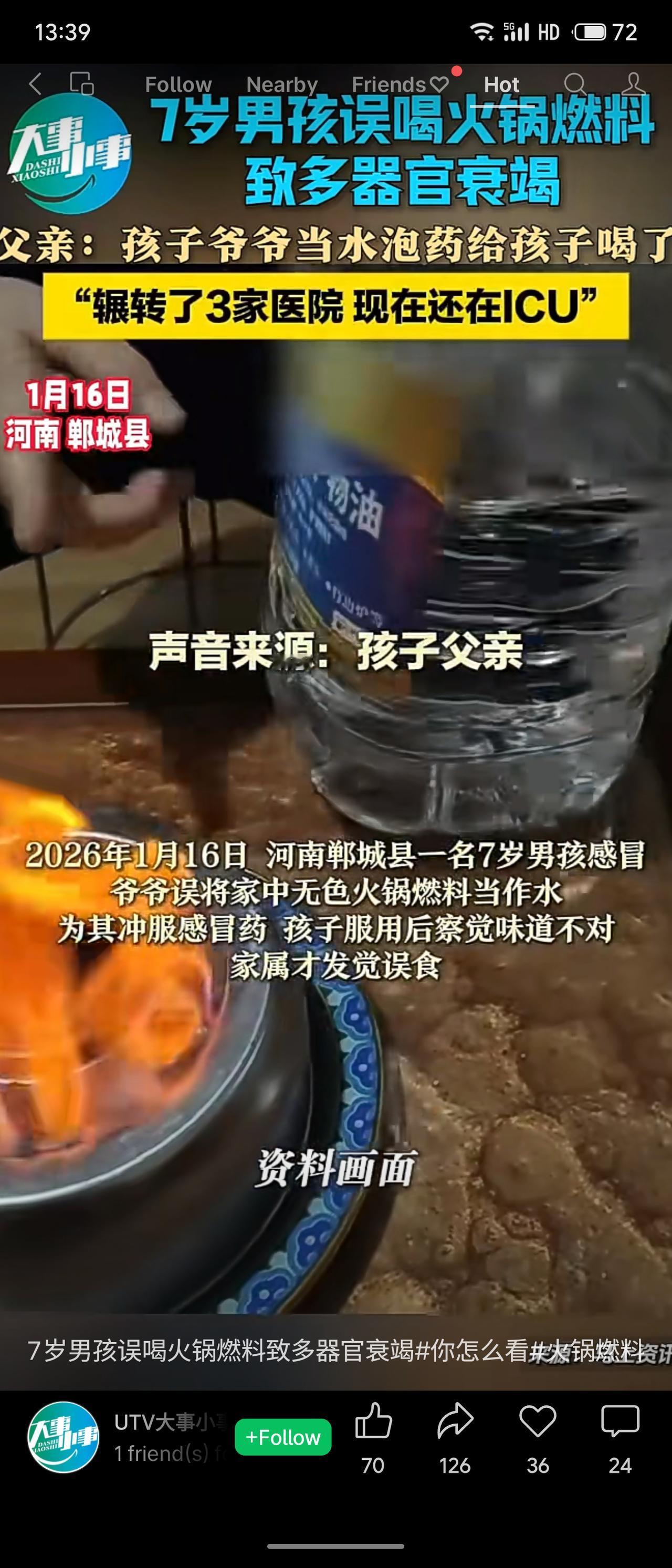 2026年1月16日,河南郸城县一名7岁男孩感冒,其爷爷误将家中无色火锅燃料当作水,给孩子冲服感冒药,导致孩子多器官衰竭。目前孩子已辗转三家医院,仍在ICU接受透析,尚未脱离生命危险。