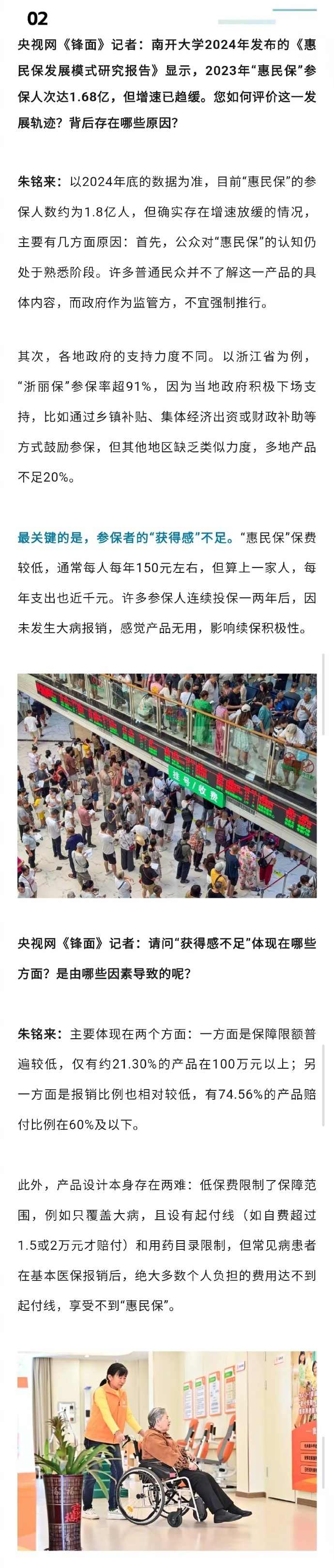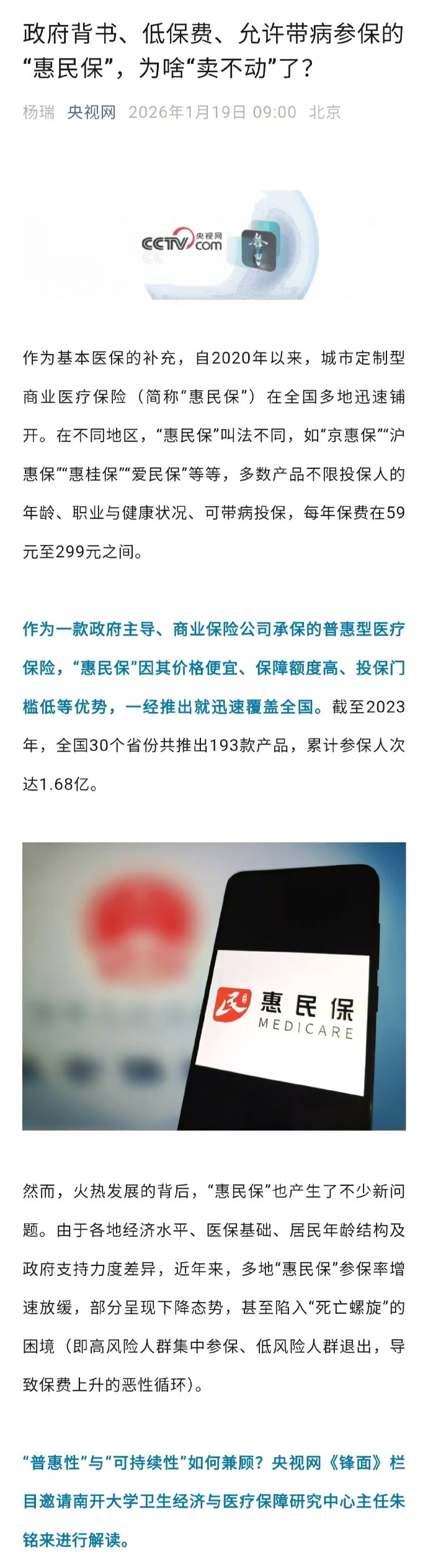 【#政府背书的惠民保为啥卖不动了#?】#多地惠民保参保率增速放缓# 作为一款政府主导、商业保险公司承保的普惠型医疗保险,“惠民保”因其价格便宜、保障额度高、投保门槛低等优势,一经推出就迅速覆盖全国。截至2023年,全国30个省份共推出193款产品,累计参保人次达1.68亿。然而近年来,多地“惠民保”参保率增速放缓,部分呈现下降态势,甚至陷入“死亡螺旋”的困境。“普惠性”与“可持续性”如何兼顾?央视网《锋面》栏目邀请南开大学卫生经济与医疗保障研究中心主任朱铭来进行解读。