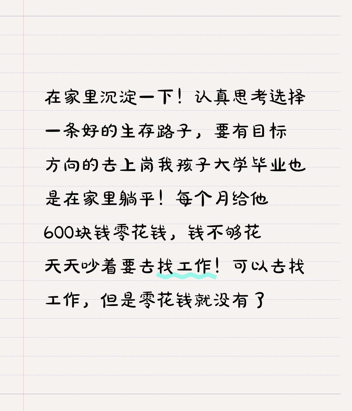 孩子大学毕业后在家躺平,这情况太常见了。我孩子也是,在家啥也不干。我就每月给600零花钱,他钱不够要找工作,我就说找工作就没零花钱了。 很多应届生觉得刚毕业不着急,在家“等机会”,结果容易长期躺平。有个25届应届生,在家待3个月,校招不看,最后连简历都不会改。还有小A全职考公几年没上岸,全靠父母;小B创业失败欠外债,父母卖房还债。 还是得让孩子早点有目标有方向去找工作,别浪费了应届生身份,在家躺久了真废了。