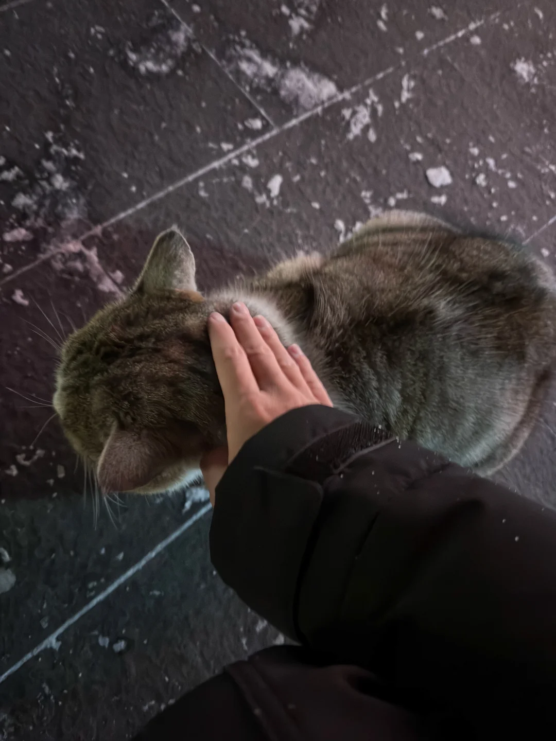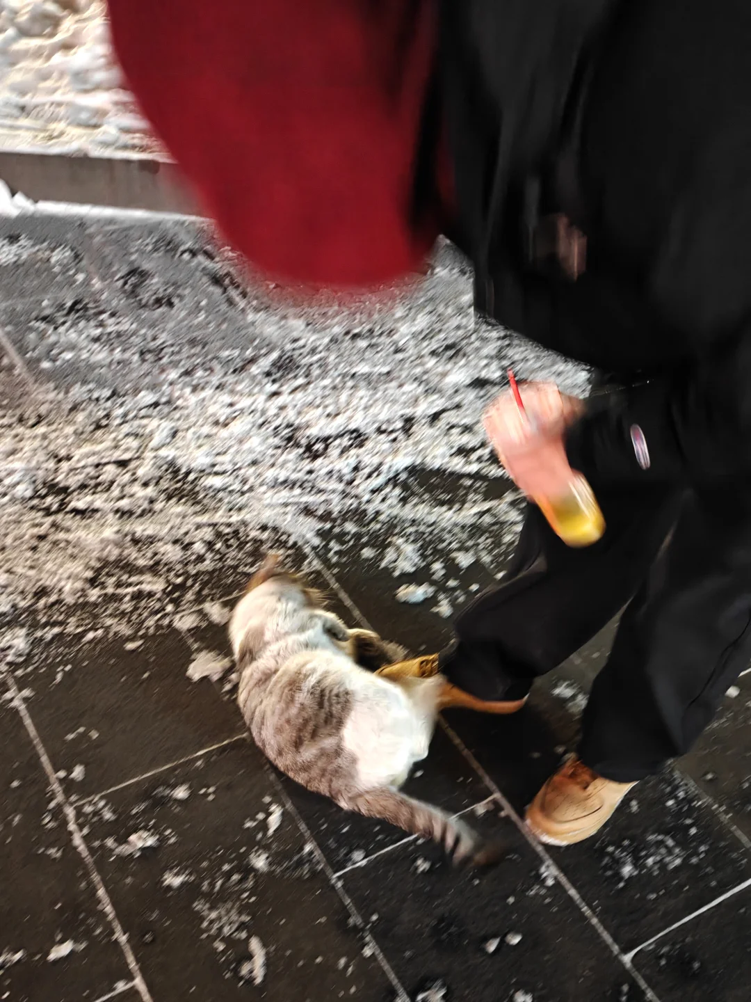 这猫就跟我过来跟我打个长面招呼,那个嘶哑的叫声和楚楚动人的可怜样儿~当时我脑海里闪过若干个想法:谁家猫跑丢的?饿不饿?是不是几天没吃东西了?会不会冻死?猫还把小爪子搭在了我的鞋子上,还给我翻肚皮~