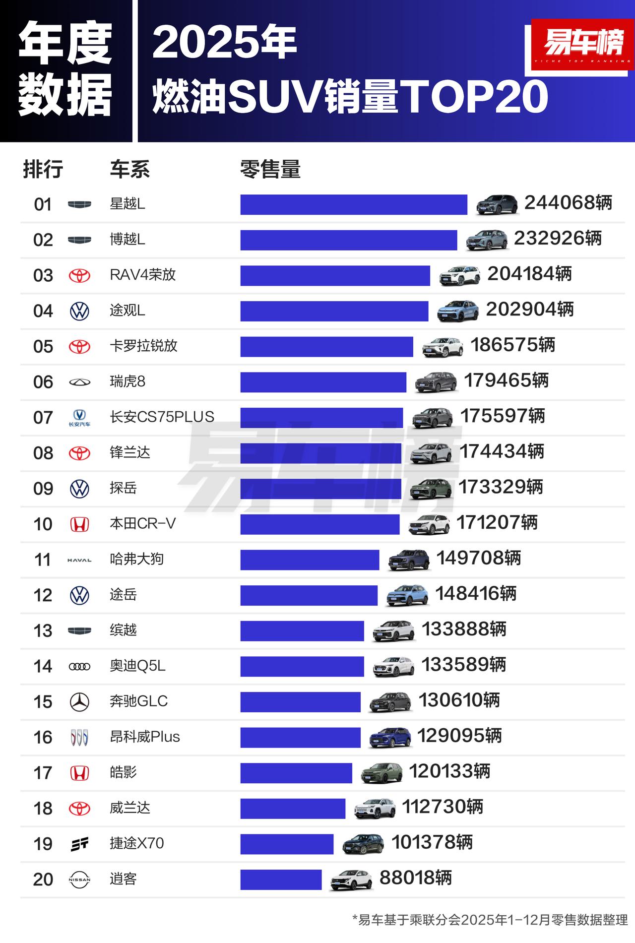 去年新能源车完成了“反超”,汽车市场油电反转,新能源车如火如荼,可油车市场也不容小觑,国产车整体崛起了。2025年燃油车销量盘点:(图:易车网)