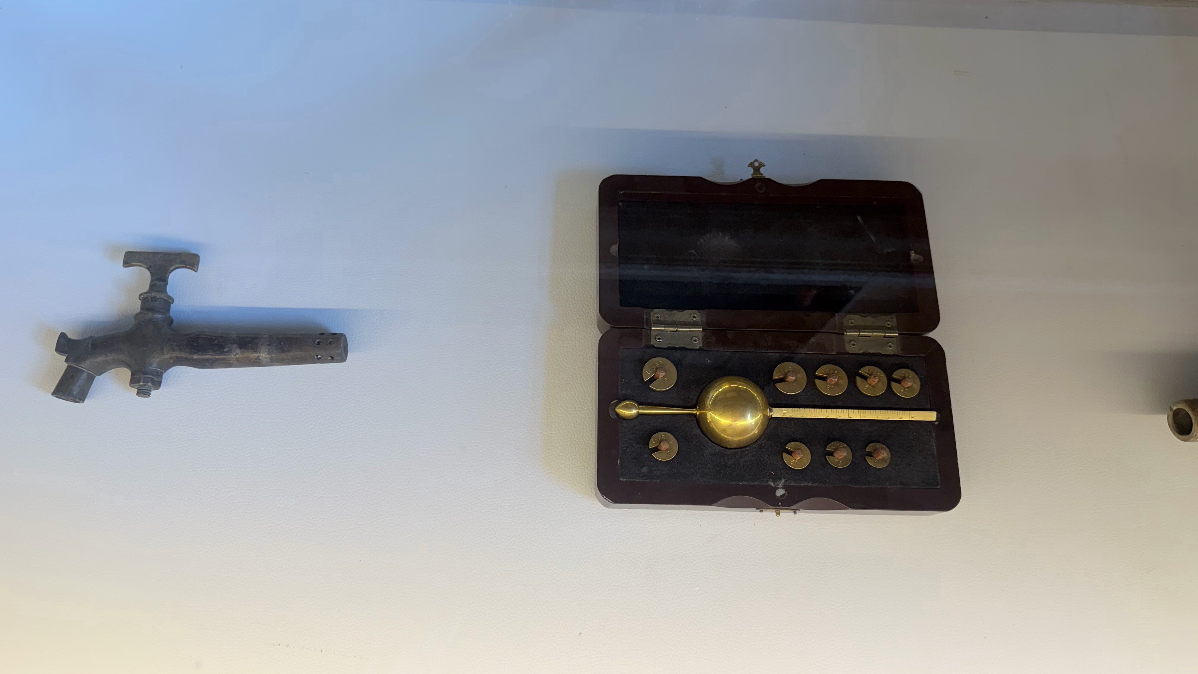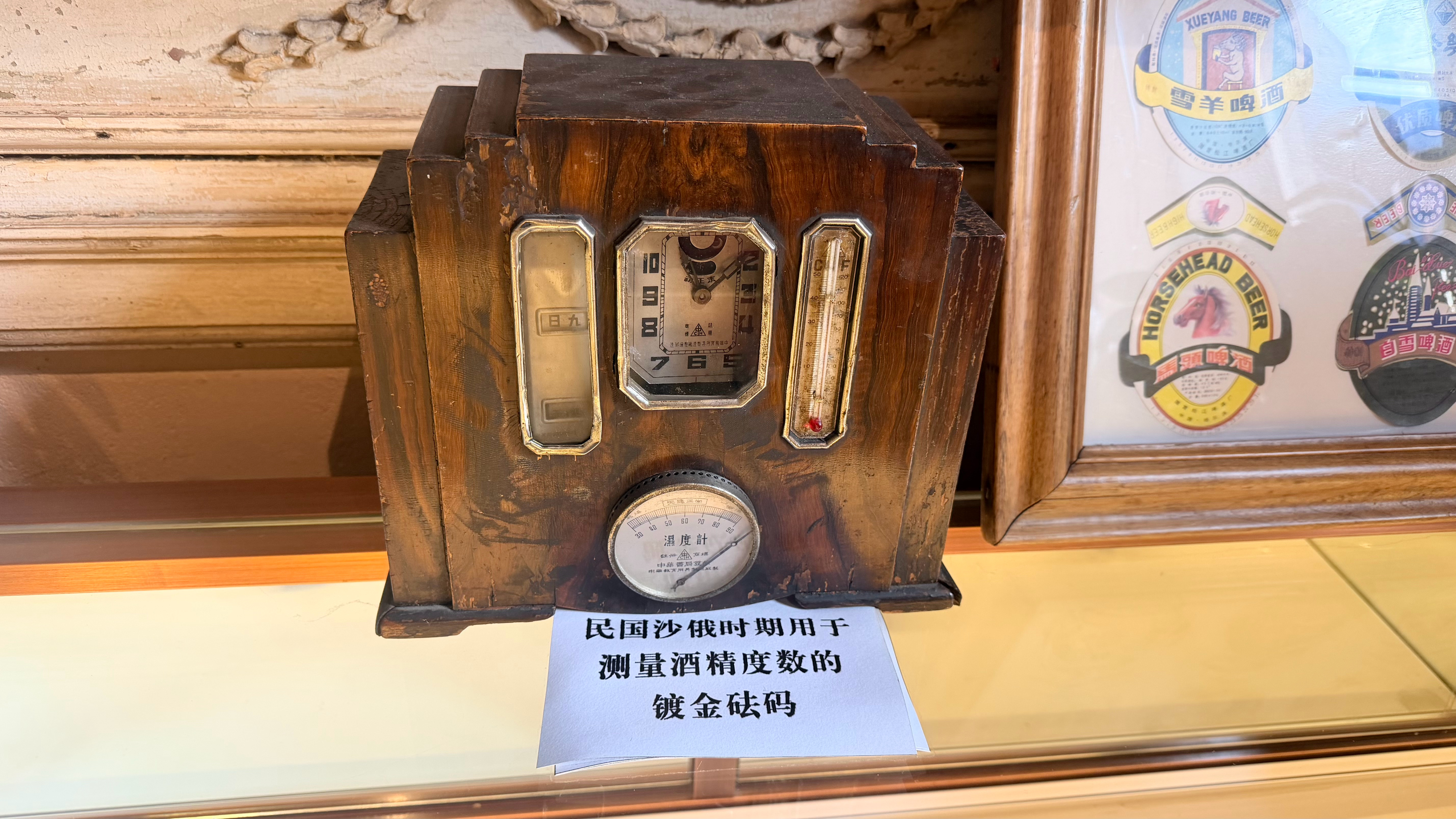 万千气象看龙江 逛着逛着,进了一家啤酒馆,老物件不少啊这个沙俄时期测量酒精度数的镀金砝码(图2),核心工作原理是基于阿基米德浮力定律,本质是一种简化版的比重计。就把它扔进酒里,酒精度越高(酒里的水越少),液体密度就越小,小金坨就会沉得更深;反过来酒精度低,密度大,小金坨就浮得高。看它露在酒面外的刻度,直接就知道酒精度多少了。镀金是为了防酒液腐蚀,让它测出来的数一直准。图一标签不是说图一那个物件 别误会 图一就是个钟带湿度计 哈尔滨·大泥啤酒馆