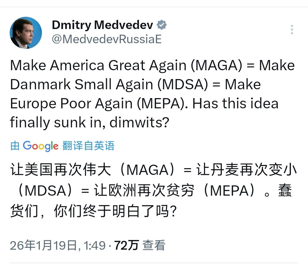 被气到直彪国粹!1月19日,梅德韦杰夫写道;“让美国再次伟大(MAGA)=让丹麦再次变小(MDSA)=让欧洲再次贫穷(MEPA)。蠢货们,你们终于明白了吗?” 说白了,梅德韦杰夫这篇发文,是直接把美国及其盟友的 “遮羞布” 给扯下来了! 说实话,这可能是美国为了维护自身霸权地位,在国际事务中一味地追求自身利益最大化,但却全然不顾盟友的死活。美国就像一个贪婪的 “吸血鬼”,不断从盟友身上汲取利益,这种私利凌驾大局的做法实在是可恶至极。 要清楚,美国的贸易保护主义政策让欧洲的制造业遭受重创,丹麦等国的出口也受到严重影响。在军事方面,美国不断在欧洲增加军事部署,让欧洲国家承担了更多的军费开支。看似美国是在 “让美国再次伟大”,但欧洲国家却因此变得更加贫穷,丹麦等国的国际影响力也在逐渐变小。这完全是损人利己的愚蠢决策。 并且,这种情况对欧洲的普通民众也产生了很大的影响。物价上涨,生活成本增加,就业机会减少。在文化方面,欧洲的多元文化也受到了冲击。 要知道,历史上英国为了自身利益,在一战和二战初期采取绥靖政策,结果导致战争规模不断扩大,欧洲遭受了巨大的灾难。美国如今的做法和当年英国的绥靖政策一样,具有极大的危害性。对话协商、合作共赢才是解决问题的正道。 而未来就两条路:一是美国继续推行这种自私的政策,欧洲国家的经济将持续低迷,与美国的矛盾会不断加深,欧洲可能会逐渐走向分裂;二是欧洲国家觉醒,开始摆脱美国的控制,加强内部团结与合作,寻找新的发展道路,但这一过程必然充满挑战。 说到底,这就是一场危险的游戏。美国不应为了自身利益而损害盟友的利益,欧洲国家也不应再对美国抱有幻想。各方都应尊重彼此的利益,通过合作来实现共同发展。 以上是小编个人看法,如果您也认同,麻烦点赞支持!有更好的见解也欢迎在评论区留言,方便大家一同探讨。