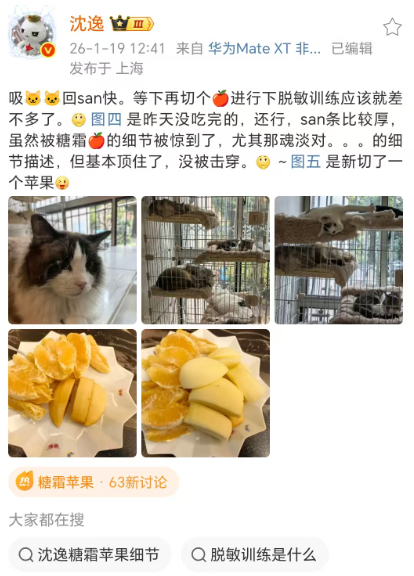 【#沈逸回应糖霜苹果#】#糖霜苹果# 因名词“美国斩杀线”走红网络的博主“斯奎奇大王”(牢A)与学者沈逸昨日在直播交谈中又冒出新词:“糖霜苹果”,相关讨论登上热搜。今日,沈逸发文并配新切苹果图,他表示虽然被“糖霜苹果”的细节惊住了,但基本顶住了。#牢A回应##沈逸 牢A#