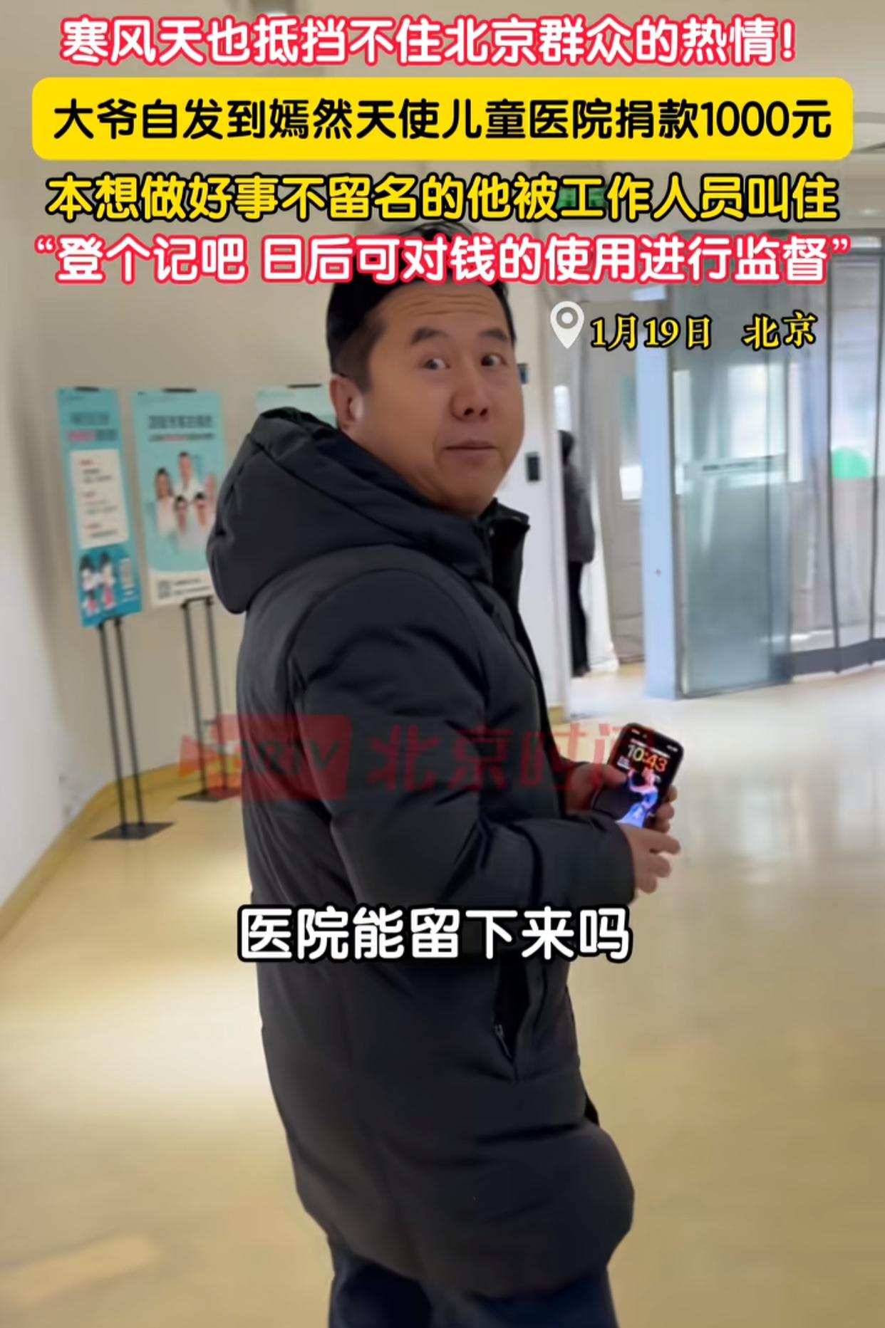 寒风天里的暖心!北京大爷匿名捐款被劝留名,理由太赞了 1月19日北京,寒风凛冽,却挡不住一份温暖的传递! 一位大爷自发来到嫣然天使儿童医院,默默捐出1000元,本想做好事不留名就离开,却被工作人员叫住:“登个记吧,日后可对钱的使用进行监督。” 大爷一开始还犹豫“这上面不用写了吧”,但听工作人员解释登记是为了让爱心款的使用更透明,他便爽快写下自己的名字。 他还真诚地说“希望医院能留下来,做了这么多公益,为社会做服务”。 最后医院送给他一份带logo的小礼物,大爷笑着收下,这一幕太暖了! 做好事不留名是善良,接受登记是对公益的信任,这双向的温暖,让这个寒风天充满了暖意。 其实像北京大爷这样默默传递善意的普通人还有很多,正是大家的关注,让这些平凡的温暖被更多人看见,让善意持续传递~ 嫣然天使公益