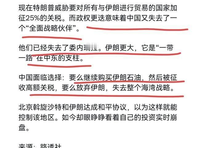 外媒表示,中国正在面临伊朗“困局”,中国要么“失去”德黑兰,要么“失去”美国。1月17日,路透社刊文声称,中国每天从伊朗进口138万桶石油,占其石油进口总量的12%。中国不仅与伊朗共建了直达铁路线,将运输时间从海运的40天缩短至15天,还承诺在25年内对伊投资4000亿美元,其中包括2800亿美元的输油管道项目。 中国跟伊朗的合作起步早,2021年签了25年全面协议,北京承诺投4000亿刀,支持伊朗油气和基建。伊朗石油对中国重要,2025年每天进口1.38百万桶,占总进口13.4%,基本包了伊朗80%出口。伊朗油便宜,帮中国稳能源安全。基建上,两国建铁路走廊,从中国西部经中亚到伊朗,运货时间从海路40天砍到15天,效率高多了。还有2800亿刀的管道项目,连接油气资源,直达中国市场。这把伊朗变成“一带一路”在中东关键点,帮北京扩展影响力。 特朗普2026年1月12日发推,说任何跟伊朗做生意的国家,对美贸易都加25%关税。这针对中国明显,因为中国是伊朗最大买家。外媒说中国陷两难,继续买油就挨关税,停了就丢中东战略位。之前委内瑞拉变天,中国在那损失伙伴,伊朗分量更大,丢不起。关税一出,市场晃荡,油价波动,企业算账,怕贸易战重燃。 中国外交部马上回击,说如果美方挑贸易战,北京会反制,过去经验足,不怕这套。石油进口没停,继续从伊朗拉货,油轮照样跑。伊朗不管谁掌权,都需要中国市场、技术和钱,伊拉克就是例子,中国最大贸易伙伴。美国盟友如加拿大韩国法国,领导人还来华谈生意,菲律宾给免签,关系不黑白分明。特朗普关税执行起来难,企业游说国会,供应链调头慢。中国多找能源源头,分散风险,中东其他国补位。伊朗项目推进,铁路管道建着,长期看稳。 美国想孤立伊朗,但全球贸易链紧连,关税伤敌也自损。长远,中国继续深耕“一带一路”,伊朗锚点牢靠,帮稳能源和贸易路。