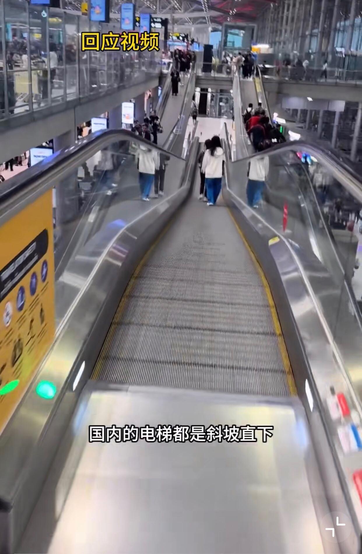 后续! 前几天一个中国女孩,去泰国旅游,在素万那普机场看到机场里的电扶梯是平的,她说自己出国长见识了,结果被网友们骂! 这不她又发了一个视频回应网友们,让网友们好好看看,泰国的电梯真的跟国内不一样…. 她说国内的电梯都是斜坡直下,而泰国的是先下坡然后中间是平的,之后又下坡,让网友们好好看看,是真的不一样…. 说实话,我也没见过[捂脸]我只见过波浪台阶式的,全平波浪的还真没有….不过这也不是什么高科技哦,值得你那么惊讶…