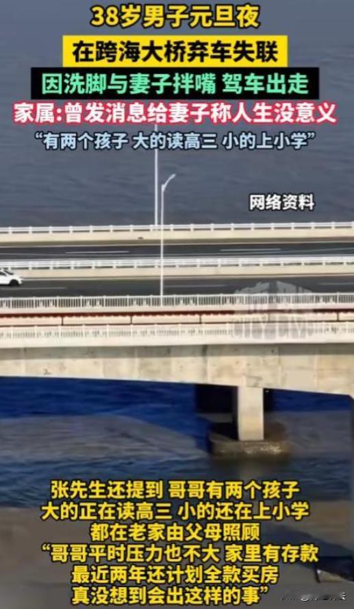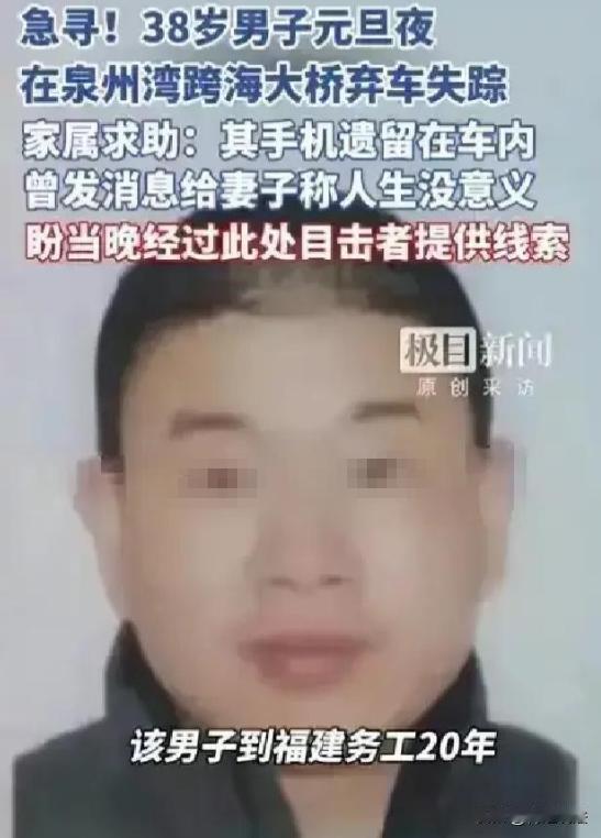 福建泉州,38岁河南籍男子2026年元旦晚回家,想直接上床睡觉,妻子拦着让他先洗脚,两人为此吵架。男子一气之下开车到跨海大桥,给妻子发“人生没有意义”,给妻子妹妹发“妻子就交给你照顾了”。妻子回拨电话无人接听,第二天民警发现男子车辆,车没熄火、双闪亮着,手机和物品都在车内,人却不见了踪影。 (来源:极目新闻) 38岁的河南籍男子小李,晚上从朋友家聚会完回家。一进家门,妻子就迎上来,说:你玩了一天,身上脏,先洗个脚再上床睡觉。 小李觉得白天和朋友玩得挺累,就想直接上床休息,便不耐烦地说:累死了,不想洗。 妻子一听,不乐意了:不洗脚多脏啊,这床还能睡吗? 就这么一句话,两人你一言我一语地吵了起来。 小李心里那股气“噌”地就上来了,越想越觉得憋屈,一甩门就下楼开车走了。 妻子以为他出去散散心,也没太在意。 小李开着车,一路狂飙到了跨海大桥。他坐在车里,看着外面的大海,心里乱糟糟的。他拿出手机,给妻子发了条信息:人生没意义。 又给妻子的妹妹发了条:妻子就交给你照顾了。 发完信息,他把手机一扔,就坐在车里发呆。 妻子在家等了一会,不见小李回来,就给他打电话。可电话那头一直没人接,妻子有种不祥的预感。她赶紧联系小李的朋友,问他们知不知道小李去哪了,可大家都说不知道。 第二天一早,妻子就报了警。 民警很快在跨海大桥上找到了小李的车,车没熄火,双闪还亮着,手机和物品都在车内,可就是不见小李的人影。 妻子急得直哭,她怎么也想不明白,就因为洗脚这么点小事,小李怎么会想不开呢? 小李的家属也赶来了,他们说小李平时挺开朗的,没什么烦心事,无负债还有存款,正准备买房,没理由想不开。 大家四处寻找,可就是找不到小李的踪迹。 有人说:这小李也太冲动了,就因为洗脚这点小事,至于吗? 也有人说:这妻子也有点过分了,人家累了一天,就不能体谅一下? 这夫妻之间,得互相理解,不然日子还怎么过? 夫妻之间的矛盾,很多时候都是因为一些小事引起的。 就像小李和妻子,就因为洗脚这点小事,就吵得不可开交。要是当时双方都能退一步,互相理解一下,也许就不会发生这样的事了。 小李突然失踪,让家人心急如焚。从法律角度看,这种情况该怎么解决呢? 小李下落不明,他的家人肯定想知道他的状况,也想在法律上有个说法。 要是长时间找不到他,家人该怎么维护自己的权益呢? 根据《民法典》第四十条,自然人下落不明满2年的,利害关系人可以向人民法院申请宣告该自然人为失踪人。 这里说的利害关系人,就包括小李的配偶、父母、子女这些近亲属。 要是小李真的失踪满2年了,他的家人就可以向失踪人住所地或者经常居住地的基层人民法院提出申请。 申请被手里后,会发出寻找下落不明人的公告,公告期是3个月。要是公告期满,小李还是下落不明,就会宣告他为失踪人。 根据《民法典》第四十二条,失踪人的财产由他的配偶、成年子女、父母或者其他愿意担任财产代管人的人代管。代管有争议,没有前面说的人,或者前面说的人没有代管能力的,由人民法院指定的人代管。 像小李这种情况,要是他被宣告失踪,他的财产就得有人代管。要是他的家人对谁代管有争议,法院就会指定一个人来代管。 要是小李后来又出现了,或者确知他的下落了,那该怎么办呢? 根据《民法典》第四十五条,失踪人重新出现,经本人或者利害关系人申请,人民法院应当撤销失踪宣告。失踪人重新出现,有权请求财产代管人及时移交有关财产并报告财产代管情况。 也就是说,小李要是回来了,他或者他的家人可以向法院申请撤销失踪宣告,代管人就得把财产移交给他,还要报告财产的管理情况。 现在小李还没被宣告失踪,只是下落不明。要是他的家人想申请宣告他失踪,得等满2年才行。 不过在这之前,家人也可以继续寻找他,说不定哪天他就回来了。 您觉得小李家人现在该怎么做呢?要是您遇到这种情况,会怎么处理呢?您对这件事有什么看法呢?