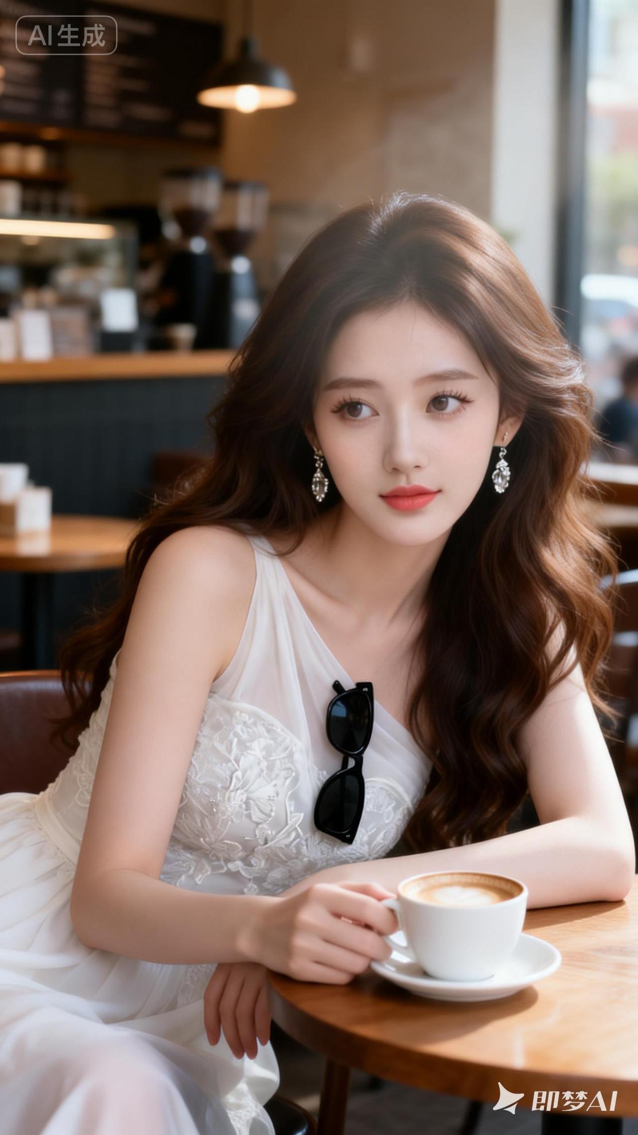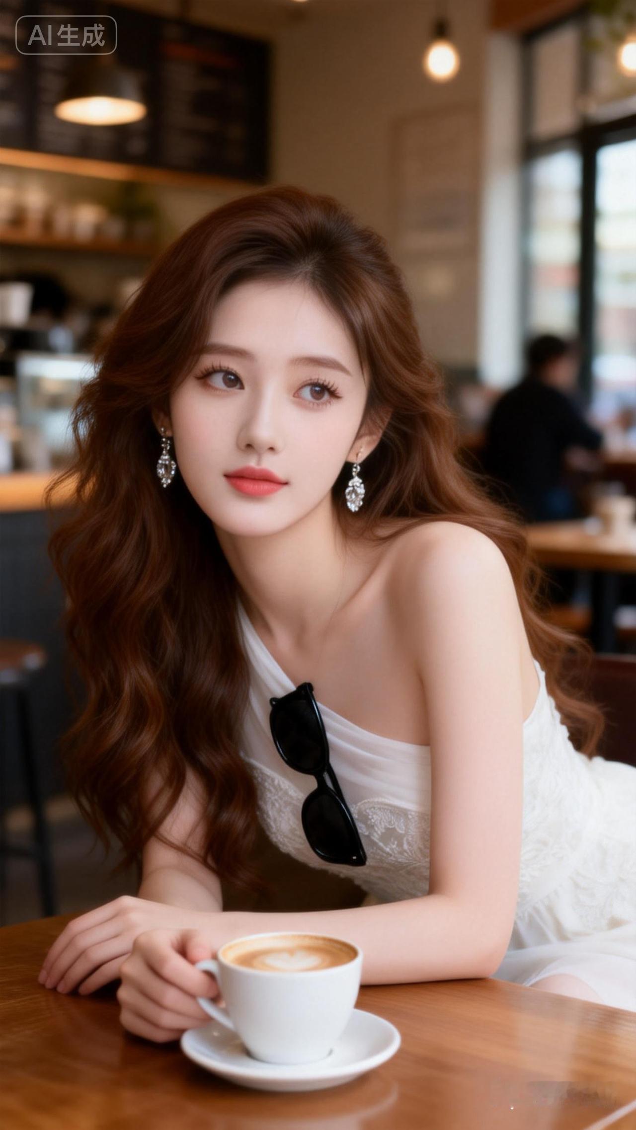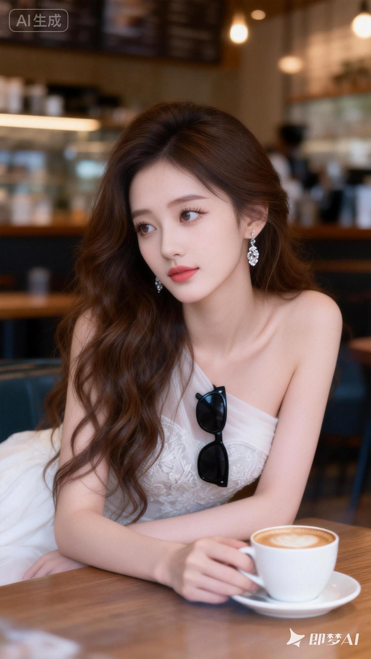 一位冷白皮的美女,她化着清透甜美的妆容,留着棕色长卷发,发丝被风吹起,尽显清冷与纯欲之感。她白嫩嫩的皮肤如琼玉般润滑,戴着耳环,身旁放着一个高端品牌的包包