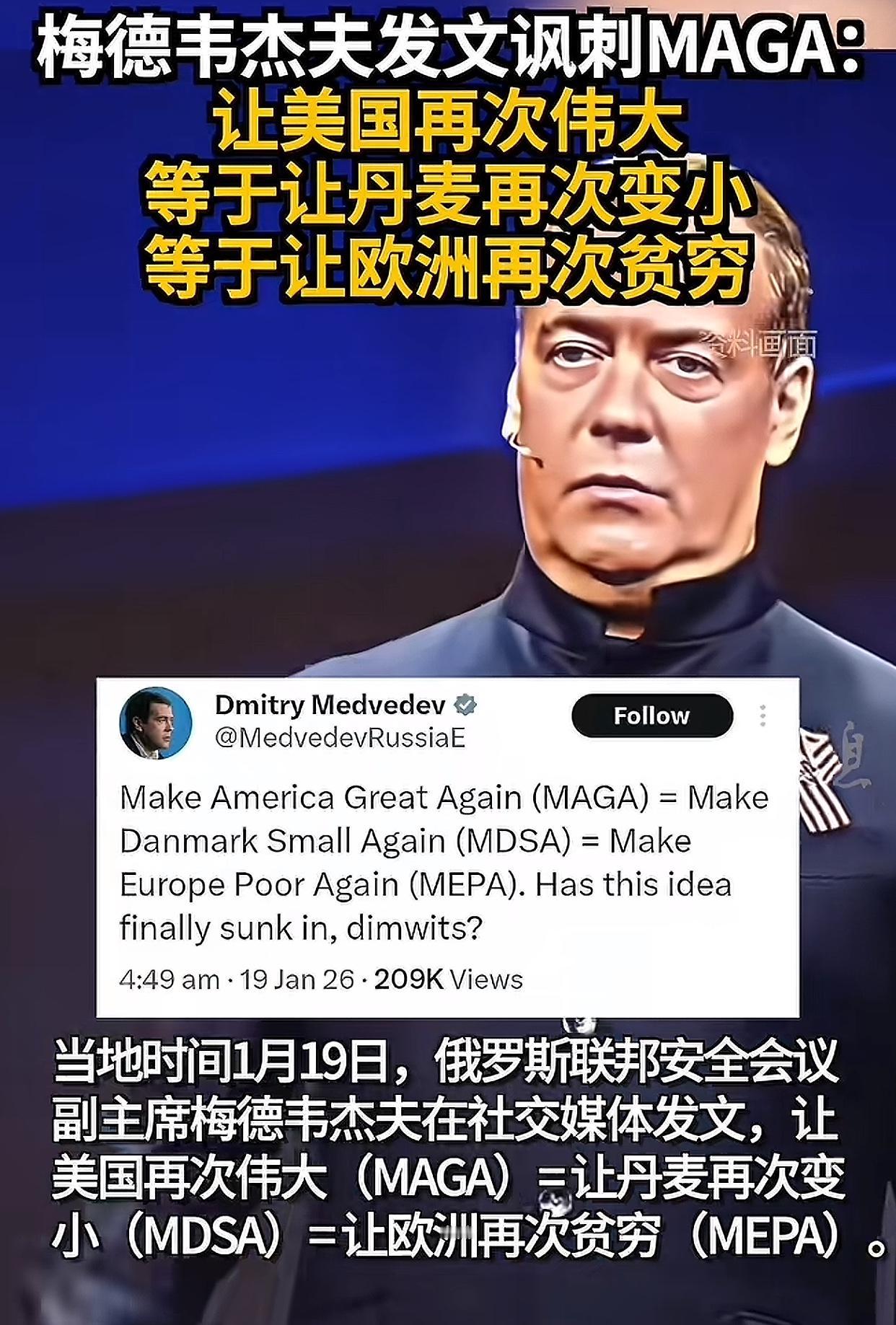 梅德韦杰夫最近这段吐槽,把美国和欧洲的关系说得明明白白。 他把美国喊了好几年的“让美国再次伟大(MAGA)”,直接改成了“让丹麦再次变小(MDSA)”和“让欧洲再次贫穷(MEPA)”。 这话直白点就是:美国要想自己“伟大”,就得从欧洲盟友身上捞好处。 丹麦这样的小国,跟着美国的政策走,国际上的话语权只会越来越小,存在感越来越弱。 而整个欧洲呢,因为听美国的话制裁俄罗斯,自己能源价格飙升、工厂停工、老百姓生活成本飞涨,这不就是活生生变穷了吗? 说白了,美国吃肉,欧洲盟友只能啃骨头,甚至连骨头都抢不到。你觉得欧洲能一直这么忍下去吗?