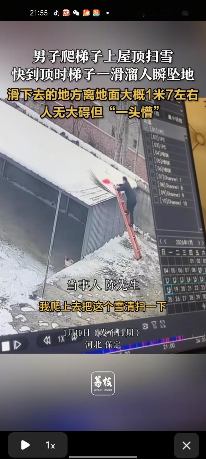 1月19日,河北保定。监控画面显示,男子爬梯子上屋顶扫雪,快到顶时因底下有积雪,梯子一滑溜人瞬间坠地,滑下去的地方离地面大概一米七左右,好在人没事,奉劝大家爬梯子要注意安全哦。