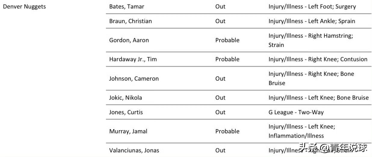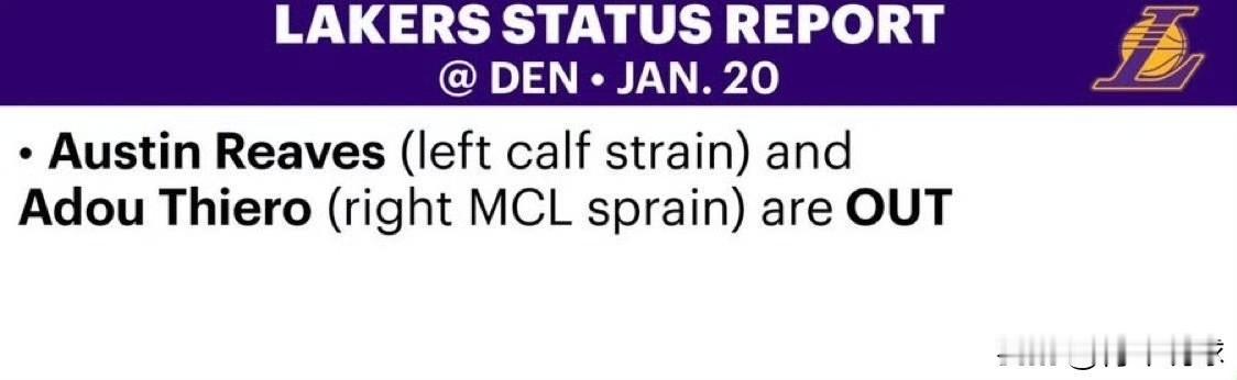 简洁!明天湖人队VS掘金队的伤病报告出炉! 今天,湖人队官方更新了最新的伤病报告,报告内容非常简洁,只有里弗斯和蒂耶罗上榜,他们都将因伤病继续缺席本场比赛。其余球员不在伤病报告之中,都可以出战明天对阵掘金队的焦点大战。掘金队的伤病报告也已经发布,约基奇、约翰逊、布劳恩将因伤缺阵;戈登、穆雷、哈达威大概率出战。 双方都有主力球员因伤缺阵,尤其是约基奇不能上场比赛,确实让这场比赛少了不少看点。对于湖人队来说需要把握住机会,赢下这场比赛,为8连客场之旅开一个好头!