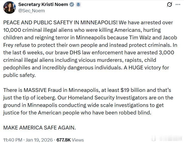 美国土安全部长克里斯蒂·诺姆:明尼阿波利斯的和平与公共安全!我们已经逮捕了超过一