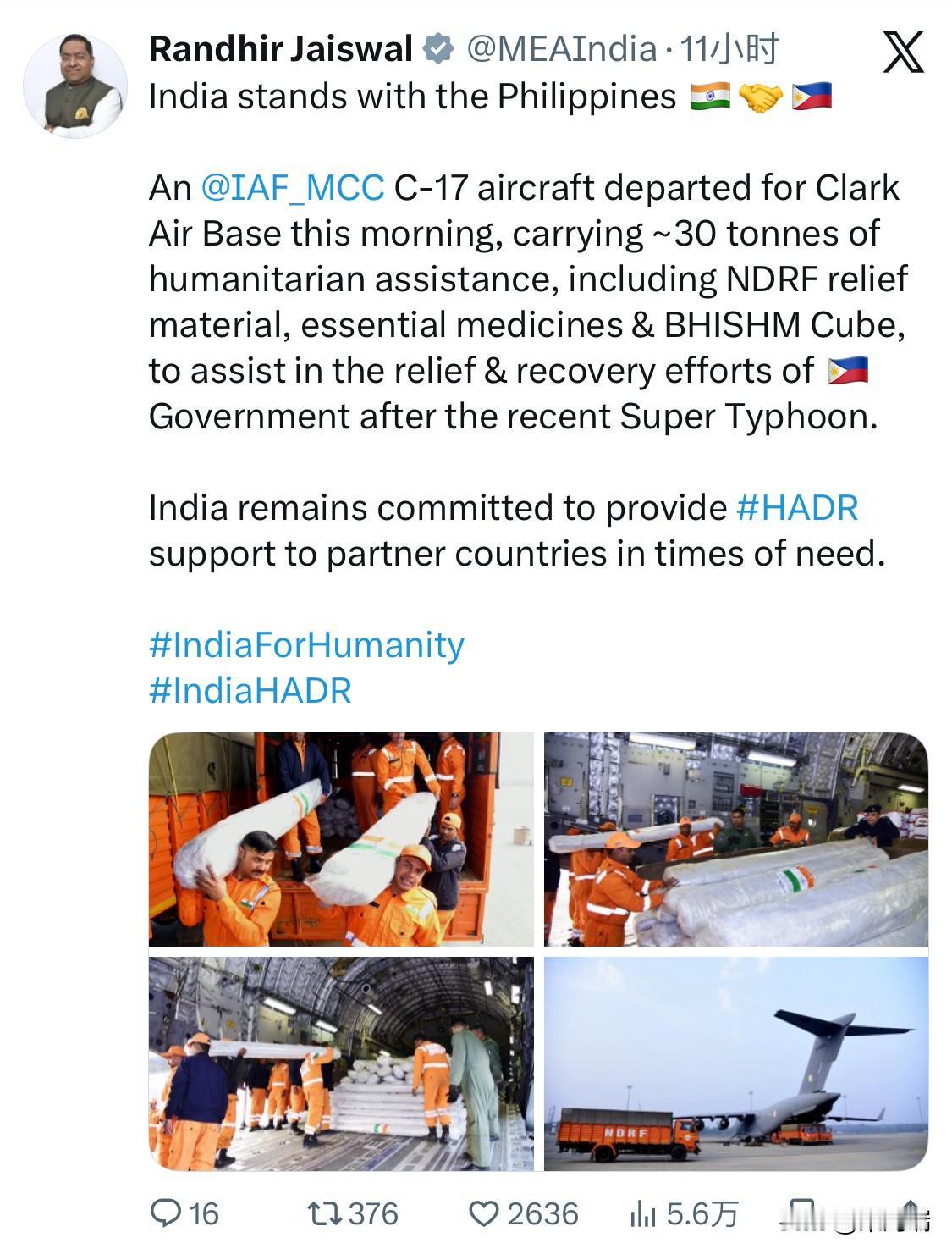 突发新闻:今天早上,印度空军(IAF)动用了其战略运输主力 C-17“环球霸王III” 远程运输机,直接飞抵菲律宾克拉克空军基地 。援助物资总重约 30 吨,涵盖了国家灾害应急部队(NDRF)的专业救援设备及急需的医疗药品 。 核心亮点(BHISHM Cube):此次援助包含了印度自主研发的 BHISHM(Bharat Health Initiative for Sahyog Hita and Maitri)便携式模块化医院方舱。这种方舱设计紧凑,可在极短时间内通过无人机或人工搬运部署,处理多达 200 名伤员,特别适用于受台风破坏严重的灾区 。 印度外交部重申,此次行动是其“东进政策”(Act East Policy)的一部分,旨在加强与菲律宾的战略伙伴关系,并作为地区安全与增长(SAGAR)愿景的积极践行者 。 这并非印度首次向菲律宾提供此类支持,反映了两国在防御和民事安全领域不断深化的合作关系。