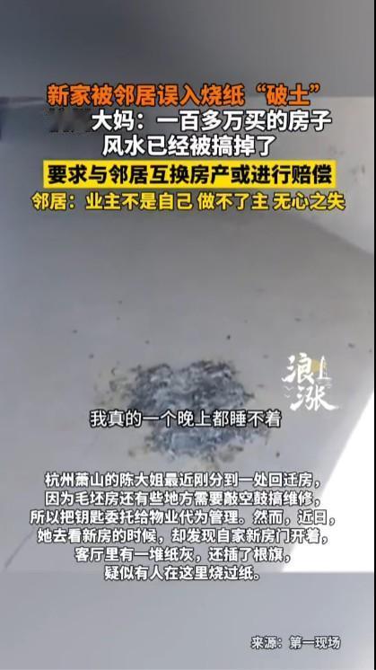 在民间习俗中,有类似在房子烧纸就是破土的说法,如果真信了这个确实很难解决。这还不是单纯的迷信问题,毕竟很多人在意风水和祝福。最稳妥的办法就是换房,如果两家房子户型和价格基本一样,也都是回迁房,那两家互换也是一种解决问题的办法。或者再由他们协商请一个风水大师破解,当然费用要让烧错纸的户主承担。