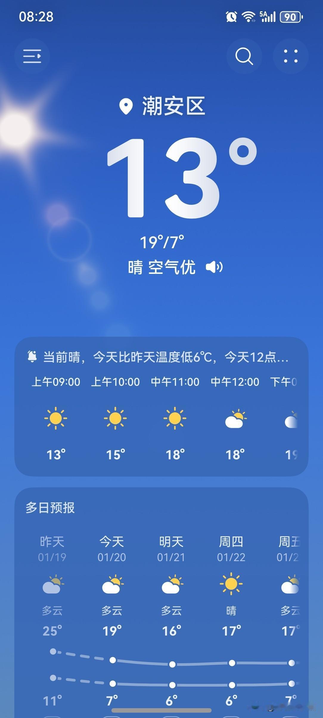 今日大寒!受较强冷空气渗透影响,广东即将从暖粒粒切换到冷冰冰! 今天(20日)早晨,北方较强冷空气前锋开始影响粤北地区,傍晚前后影响粤中部地区,20日夜间影响南部沿海;粤北下降7~10℃,中部下降5~7℃,南部沿海下降3~5℃;过程最低气温出现在22日前后,21~23日粤北有大范围5℃以下低温,粤北高海拔山区﹣4~0℃,有雨夹雪或冻雨。 广东的小伙伴们!冻手冻脚的日子即将上线啦! 今天(20日),潮州喜提大好晴天,气温7~19℃,此刻气温13℃,体感温度10℃。 今日份冷空气即将送达,气温虽然还没下降,不过,早上的北风突然加大,吹得树叶沙沙作响,体感也得冷了几分。 一起来看看今天的天空吧!画风与昨天极为相似,都是太阳当空照,又带些许薄雾,给太阳增添了朦胧感,也让阳光变得更温暖。看来今天的阳光,妥妥的走温柔风路线了。 今天的天气,依然值得拥有一个五星好评! 如此天气!元芳,你怎么看? [捂脸][我想静静][捂脸][捂脸][大笑][捂脸][捂脸][大笑]