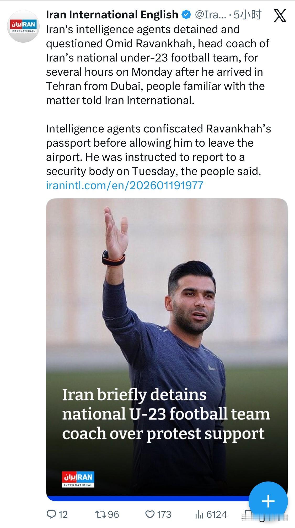据知情人士向伊朗国际电视台透露,伊朗情报人员周一在伊朗国家U23足球队主教练奥米德·拉万哈赫从迪拜抵达德黑兰后,对其进行了数小时的拘留和讯问。 据知情人士透露,情报人员没收了拉万卡赫的护照,才允许他离开机场。他被要求于周二向安全部门报到。