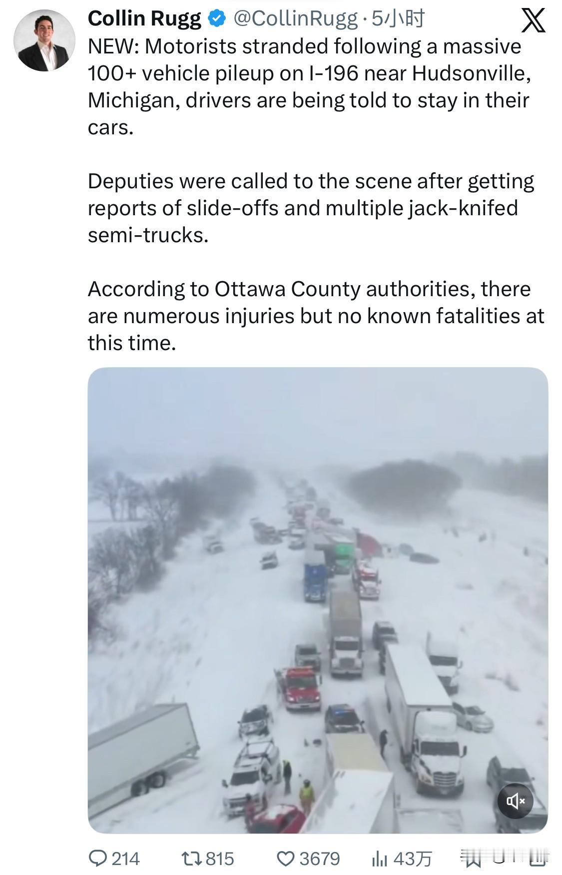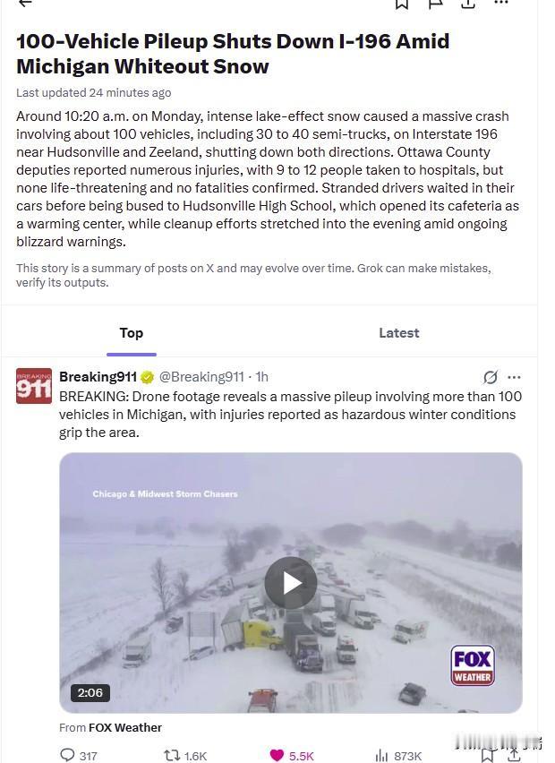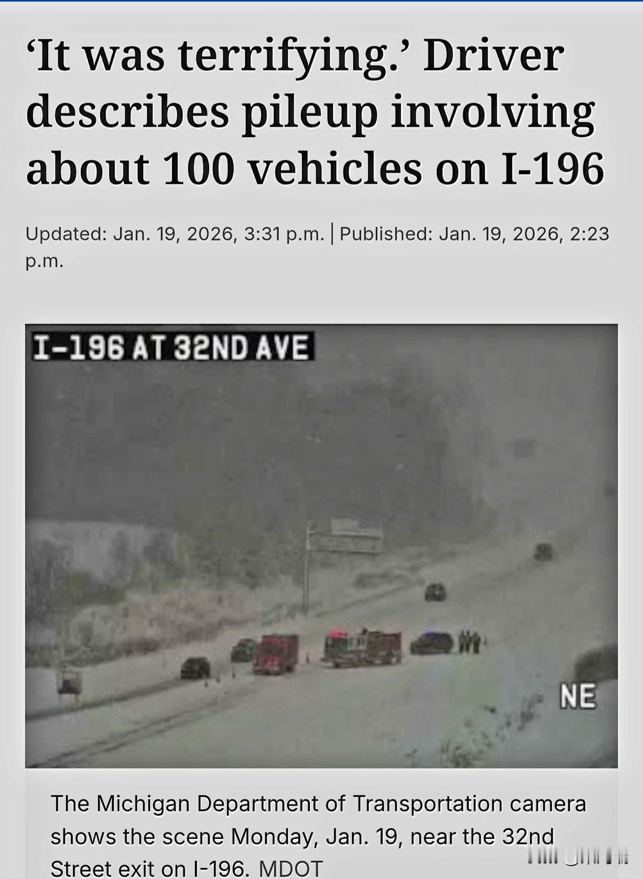 最新消息:美国密歇根州哈德逊维尔附近 I-196 号州际公路发生 100 多辆车连环相撞事故,导致大量司机被困,司机被告知待在车内。 接到多起半挂卡车滑出路面和折叠事故的报告后,警员赶到现场。 据渥太华县当局称,有多人受伤,但目前尚无死亡报告。