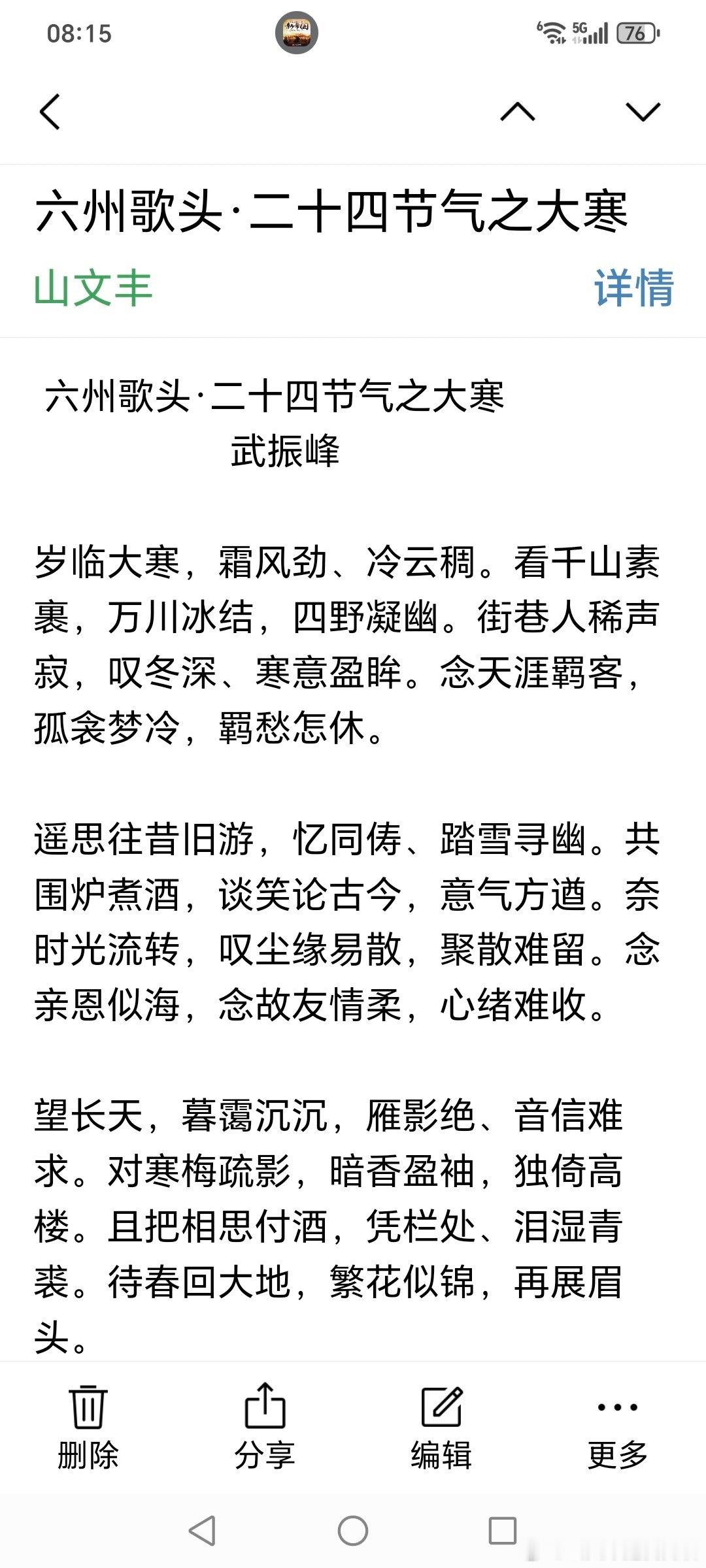 六州歌头·二十四节气之大寒 武振峰岁临大寒,霜风劲、冷云稠。看千山素裹,万川冰结,四野凝幽。街巷人稀声寂,叹冬深、寒意盈眸。念天涯羁客,孤衾梦冷,羁愁怎休。遥思往昔旧游,忆同俦、踏雪寻幽。共围炉煮酒,谈笑论古今,意气方遒。奈时光流转,叹尘缘易散,聚散难留。念亲恩似海,念故友情柔,心绪难收。望长天,暮霭沉沉,雁影绝、音信难求。对寒梅疏影,暗香盈袖,独倚高楼。且把相思付酒,凭栏处、泪湿青裘。待春回大地,繁花似锦,再展眉头。二十四节气